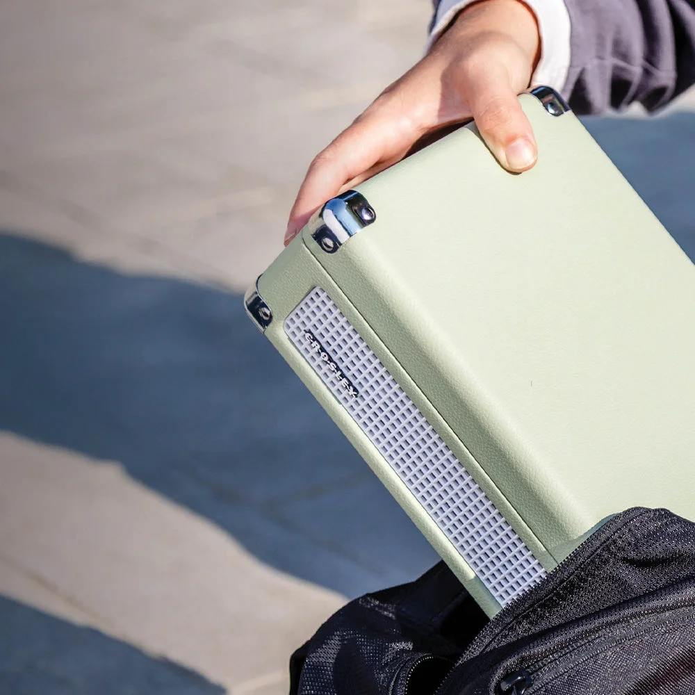 -Iconic Design – Inspired by Crosley’s beloved Cruiser turntable, featuring a suitcase-style shell, metal clasps, and retro detailing.