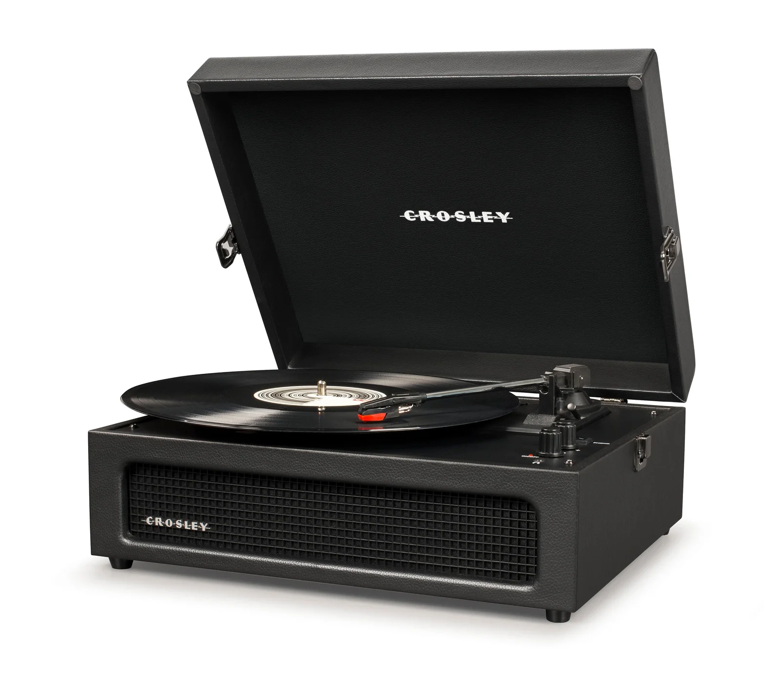 Crosley Voyager Black - Bluetooth Portable Turntable Record Storage Crate.Join Crosley's mission to bring analogue music to the masses with the Crosley Voyager three-speed turntable. The clean, vintage-inspired aesthetic fits into any space, while the lightweight design allows this record player to travel “further than anyone, or anything in history.” Spin 33 1/3, 45, or 78 RPM records or launch the built-in Bluetooth transmitter or receiver to send your digital music wirelessly. Discover the RCA outputs on the back that allow you to easily plug into your existing solar music system or bigger speakers to add propulsion to any party. Drop the needle on a reissue of the golden record, probe the adjustable pitch control knob to dial in the speed and prepare for blast off!