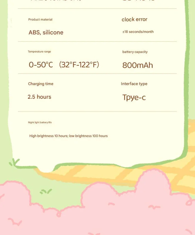 Start your day with a smile with our Adorable Animal Digital Alarm Clock! This multi-functional clock features a clear display showing time, AM/PM, day of the week, and indoor temperature (0-50C / 32-122F). It offers 3 alarm groups with 5 selectable ringtones, a countdown timer (double-click to activate), snooze mode, hourly chime option, stepless dimming night light, delayed light-off function, and adjustable volume. The new alarm mode allows you to customize which days of the week each alarm sounds. With an 800mAh battery rechargeable via Type-C in about 2.5 hours, the night light can last up to 10 hours on high brightness or 100 hours on low. Made from ABS and silicone, it's a perfect and fun companion for bedrooms, studies, or as a sleep aid. Its cute animal design makes it a great gift for kids and adults alike.