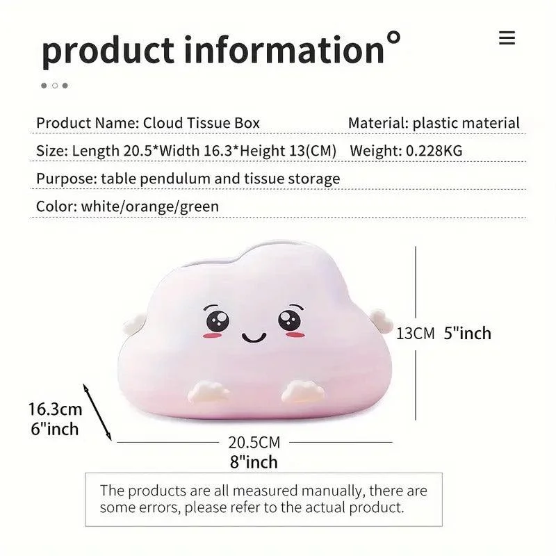 Add a touch of whimsy to your space with this cloud-shaped tissue box. Perfect for any room, its playful design blends functionality with charm, making it an ideal addition to your coffee table, desk, or bedside. Made from durable plastic, this lightweight tissue box ensures long-lasting use while offering an easy and convenient way to store tissues. Whether in your child's room, living room, or office, its cute design adds both style and practicality.