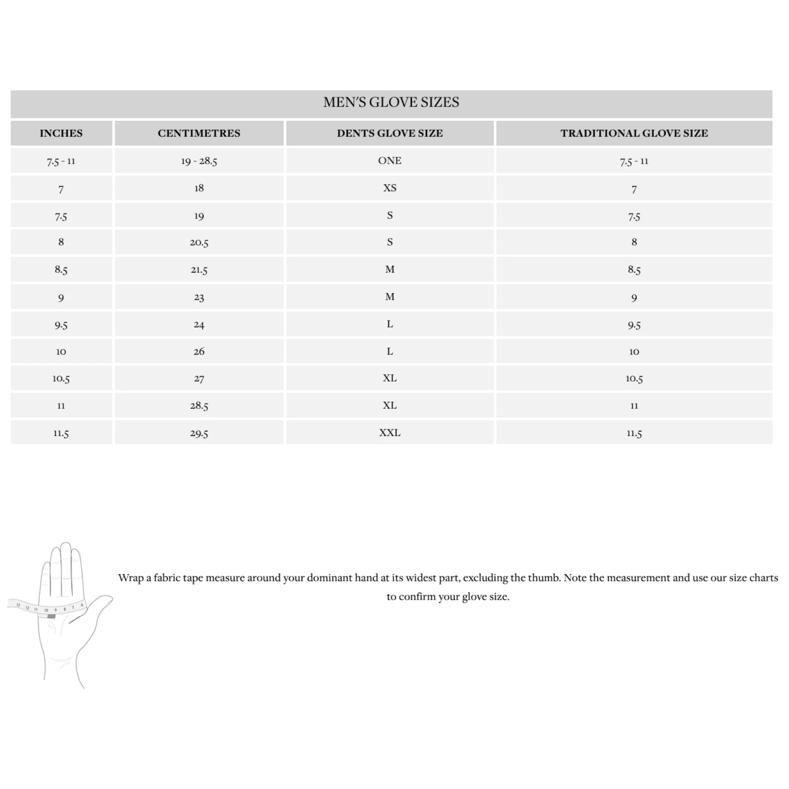 | GLOVE SIZE | INCHES | CENTIMETRES | S, M, L OR XL |