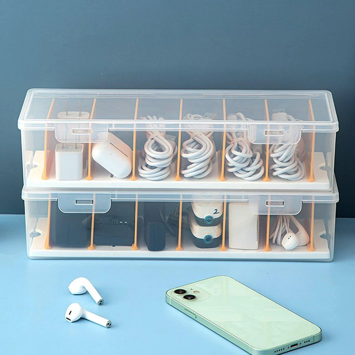 Keep your workspace tidy and your cables neatly organised with this data cable storage box. Designed with removable spacers and a dustproof lid, it provides a versatile and efficient way to store charging cables, plugs, and accessories. The transparent construction allows for quick identification of items, while its large capacity accommodates multiple cables and charging heads. Perfect for maintaining an organised and clutter-free desktop, this storage box ensures your accessories remain clean and in excellent condition.