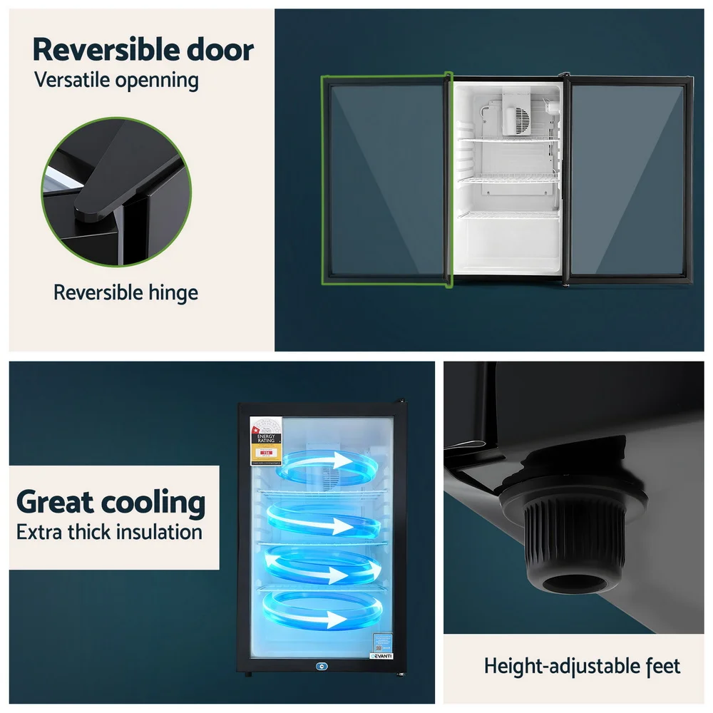 Our portable Devanti Bar Fridge is great for keeping a variety of food and beverages chilled and cooled without taking up too much space. Designed with six temperature settings, the energy-efficient bar fridge lets you set your desired coolness and freshness. Other great features include adjustable shelves, double-glazed door, height-adjustable feet, built-in handle and consistent refrigeration to name a few. The compact bar fridge is well-made for robust use, such as the extra thick insulation and a built-in LED lamp to ensure operation is smooth, quiet and hassle-free. This versatile countertop fridge can also be used as a freestanding unit.An ideal mini fridge for any space.