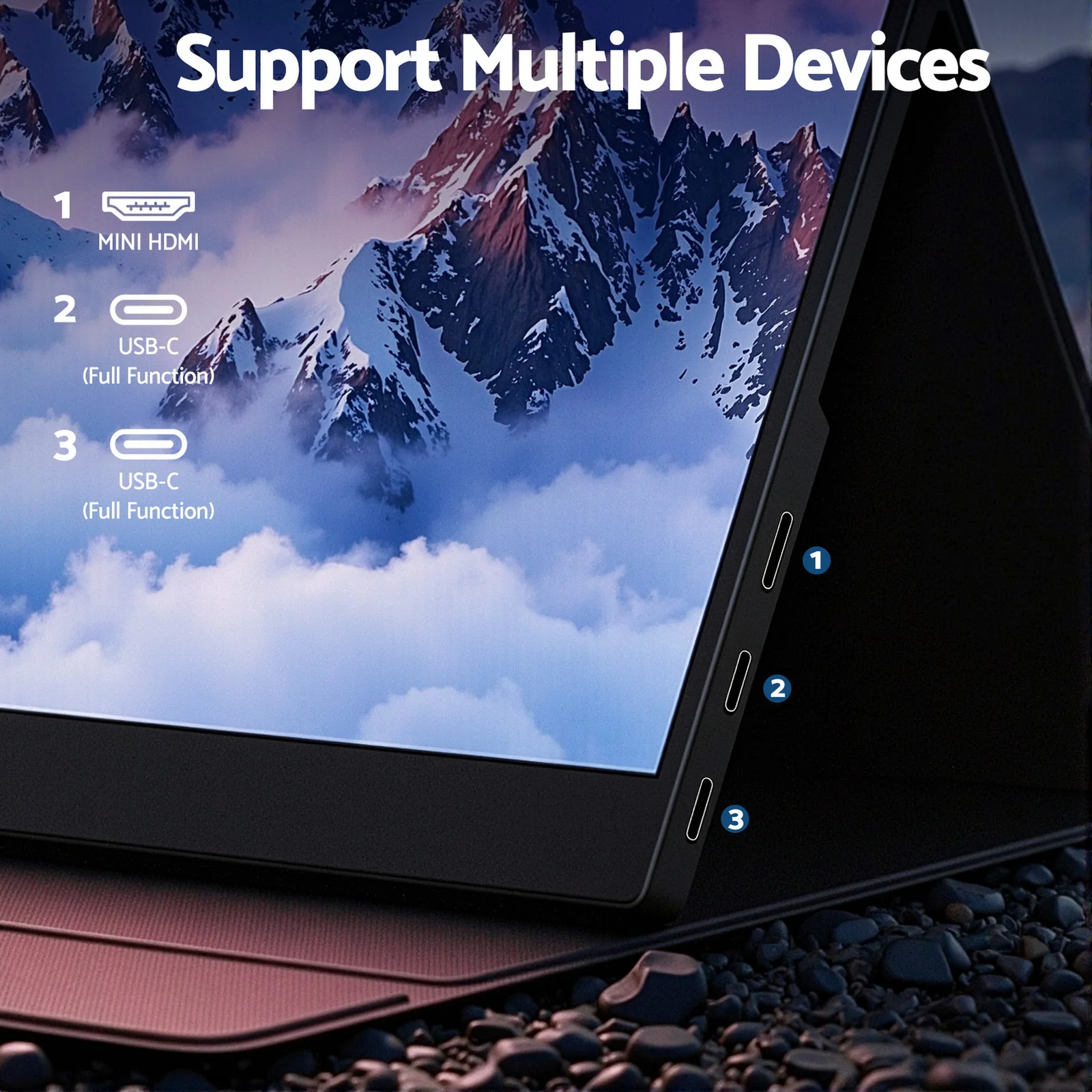 Experience versatility with the Devanti 15.6" Portable Monitor. This 1080P FHD IPS display offers 100% sRGB clarity and 178° viewing angles. Easily connect laptops, PS4/Xbox, or Type-C 3.1 smartphones via Mini HDMI or USB-C one-cable output for immediate mirroring. Features dual stereo speakers, user-friendly scroll button controls, and includes a magnetic leather case. Ideally used as a gaming screen or second monitor for mobile productivity.