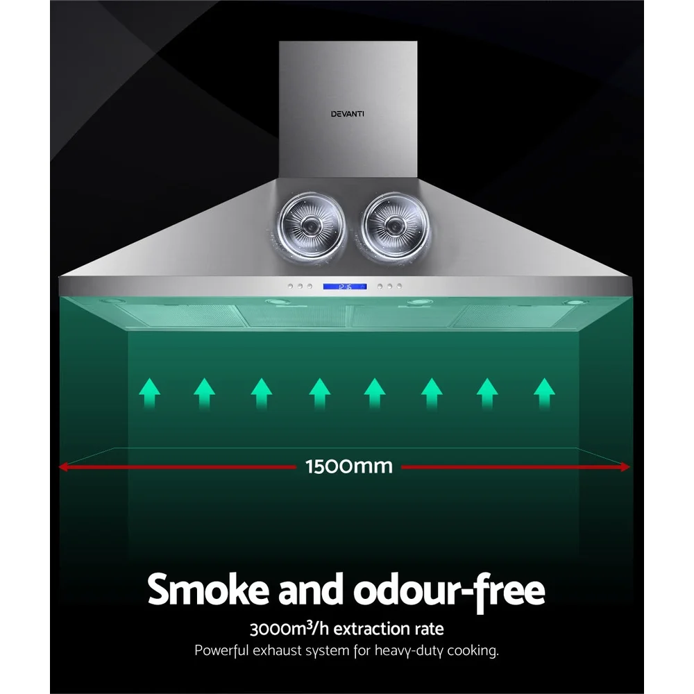 Thick smoke and steam from your cooking. Stifling odours all around. And the hood's not doing its work in clearing the mess. Yes, it's the bane of every conscientious chef who wants the cooking environment to be as pleasant as possible. And that wish has come true with our Devanti 1500mm wall mount range hood.