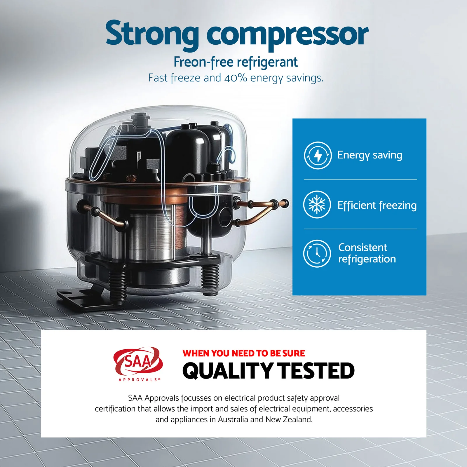 Freon-free refrigerant and enhanced heat dissipation enable low energy consumption