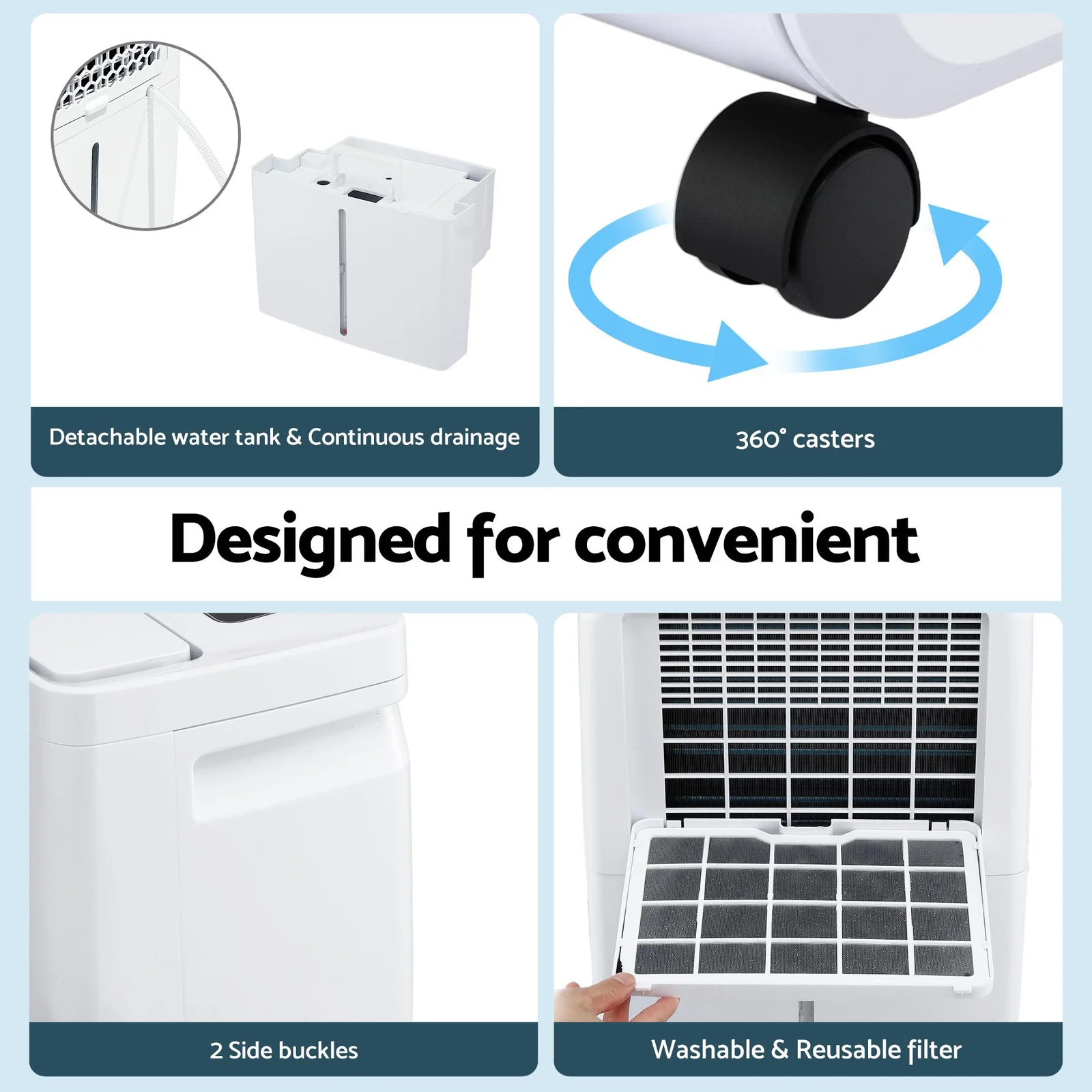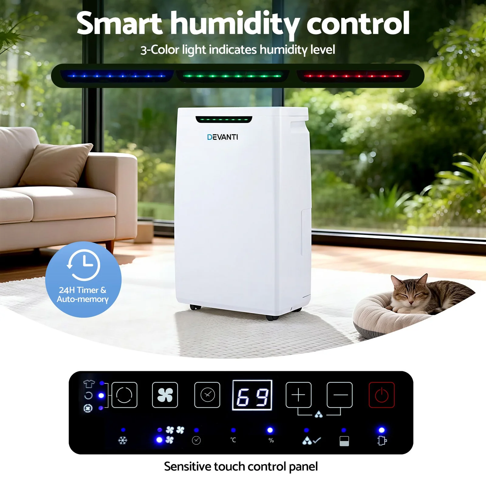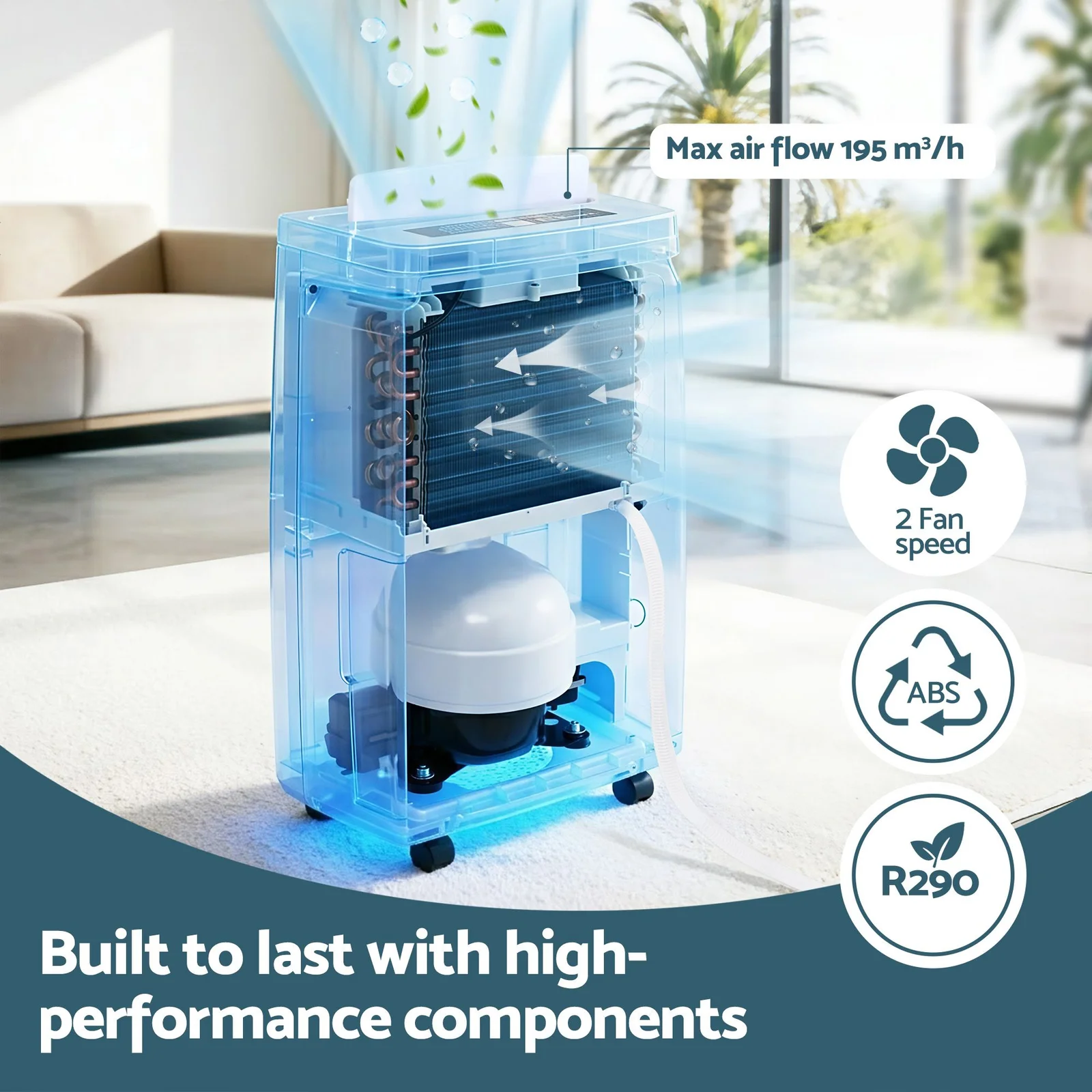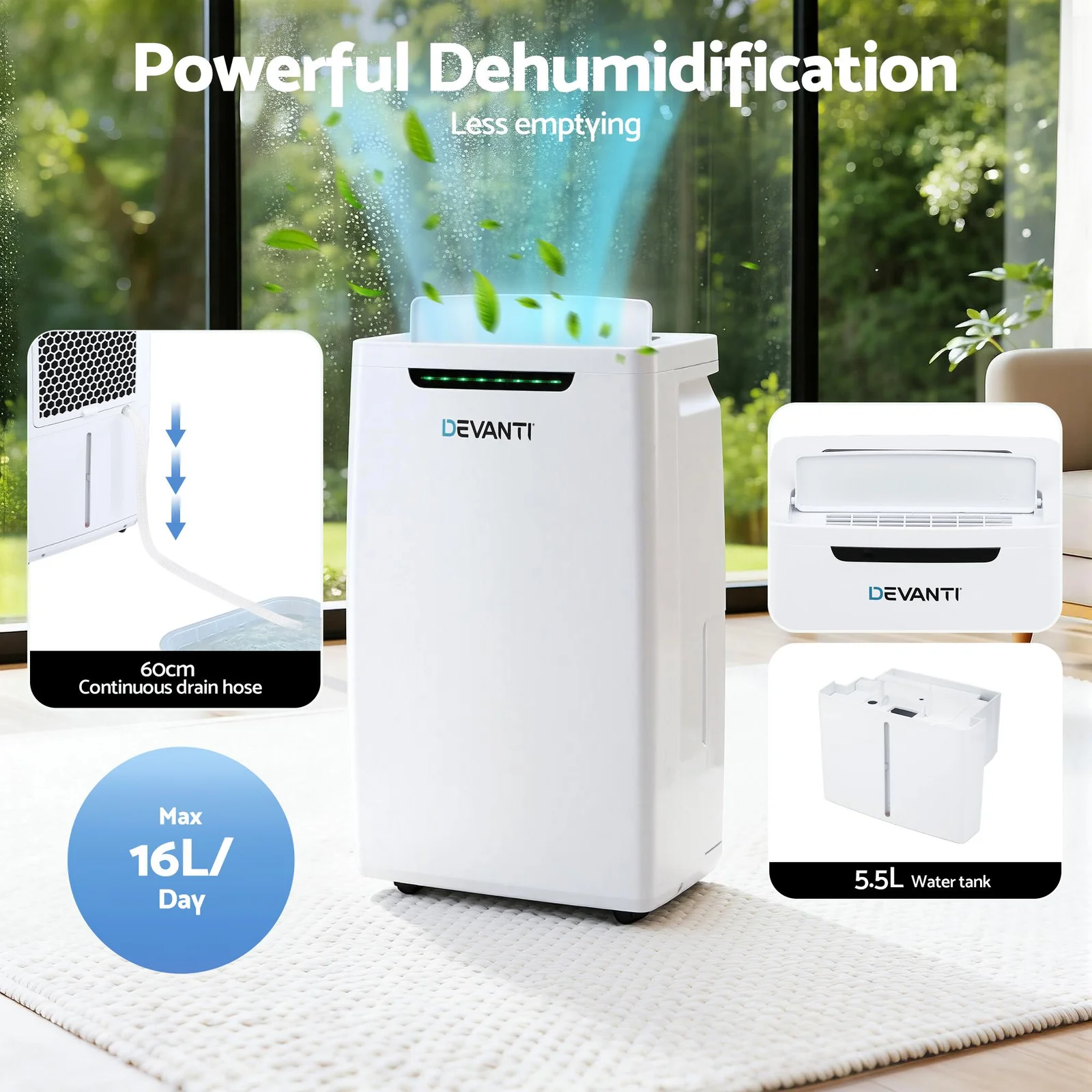 Create a healthy, comfortable home with our high-performance 16L/Day Dehumidifier. Combining dehumidification, a fan, and clothes-drying modes, it features a large 5.5L water tank and powerful 195m³/h airflow to tackle damp basements, bathrooms, or laundry rooms. Enjoy intuitive touch controls, a 3-color humidity indicator, and whisper-quiet 48dB operation. With a 60cm continuous drain hose, easy-glide casters, and eco-friendly R290 refrigerant, staying dry has never been so effortless.