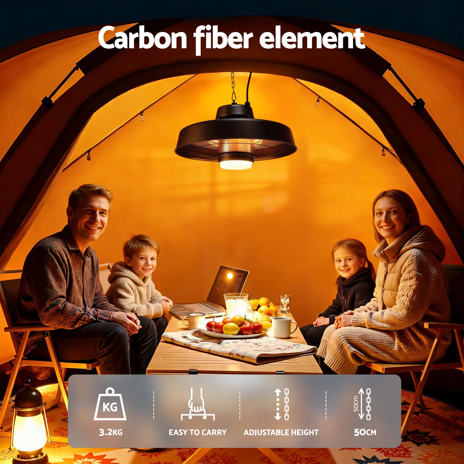 Transform your patio or pergola with the Devanti electric ceiling heater. This powerful 2000W infrared heater features durable carbon fibre tubes (5000hrs life) and three heat settings (800/1200/2000W) controlled by remote. With an IPX4 waterproof rating, it's built for Australian outdoors. The integrated 8W LED light (700 lumens) adds ambiance. Includes 50cm chain for easy ceiling mounting. The stylish black steel body fits any decor.