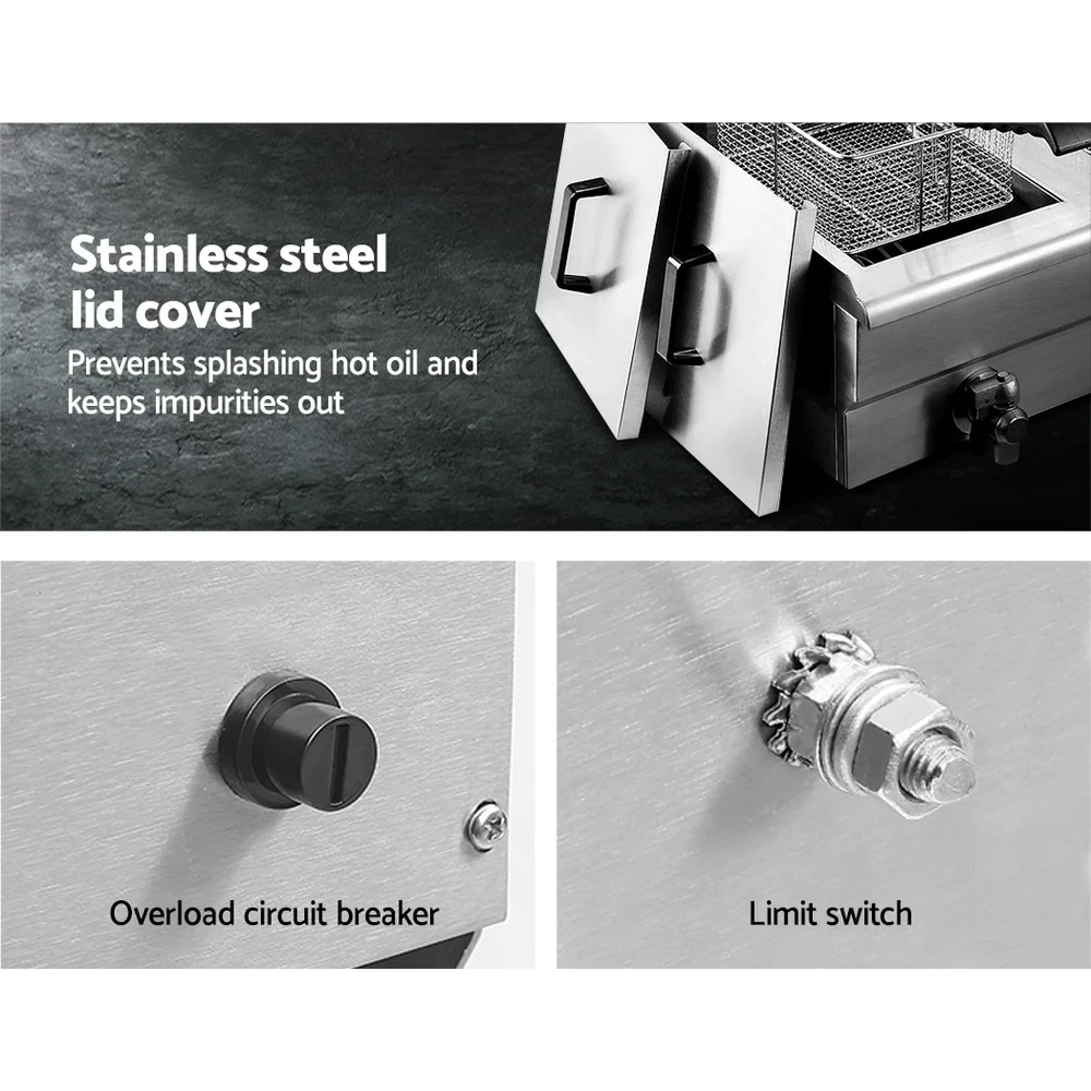Practical, reliable and durable. That essentially sums up our Devanti Commercial Deep Fryer. Our food-grade stainless steel countertop twin deep fryer is versatile and safe to use in every way. With its S-shaped heating element, the deep fryer has a fast heat-up and recovery times, and even heat distribution to keep up with a busy kitchen. It comes with independent switches for each frying compartment so that you can cook at different temperatures simultaneously with no mixing of flavours. The stainless steel lid covers help to prevent splashing oil as well as keeping impurities out. The handles are also made heat-resistant for safety while the basket hangers make it convenient to cool down food or drain excessive oil from the frying baskets. Cleaning and maintenance of the deep fryer is also made hassle-free with oil drain taps to discard used oil and a 90? tilting head for easy accessibility to the whole fryer. Other safety features include oil level indicators, temperature probe to monitor overheating, overload circuit breaker, non-slip rubber feet and a SAA-certified 15A plug.