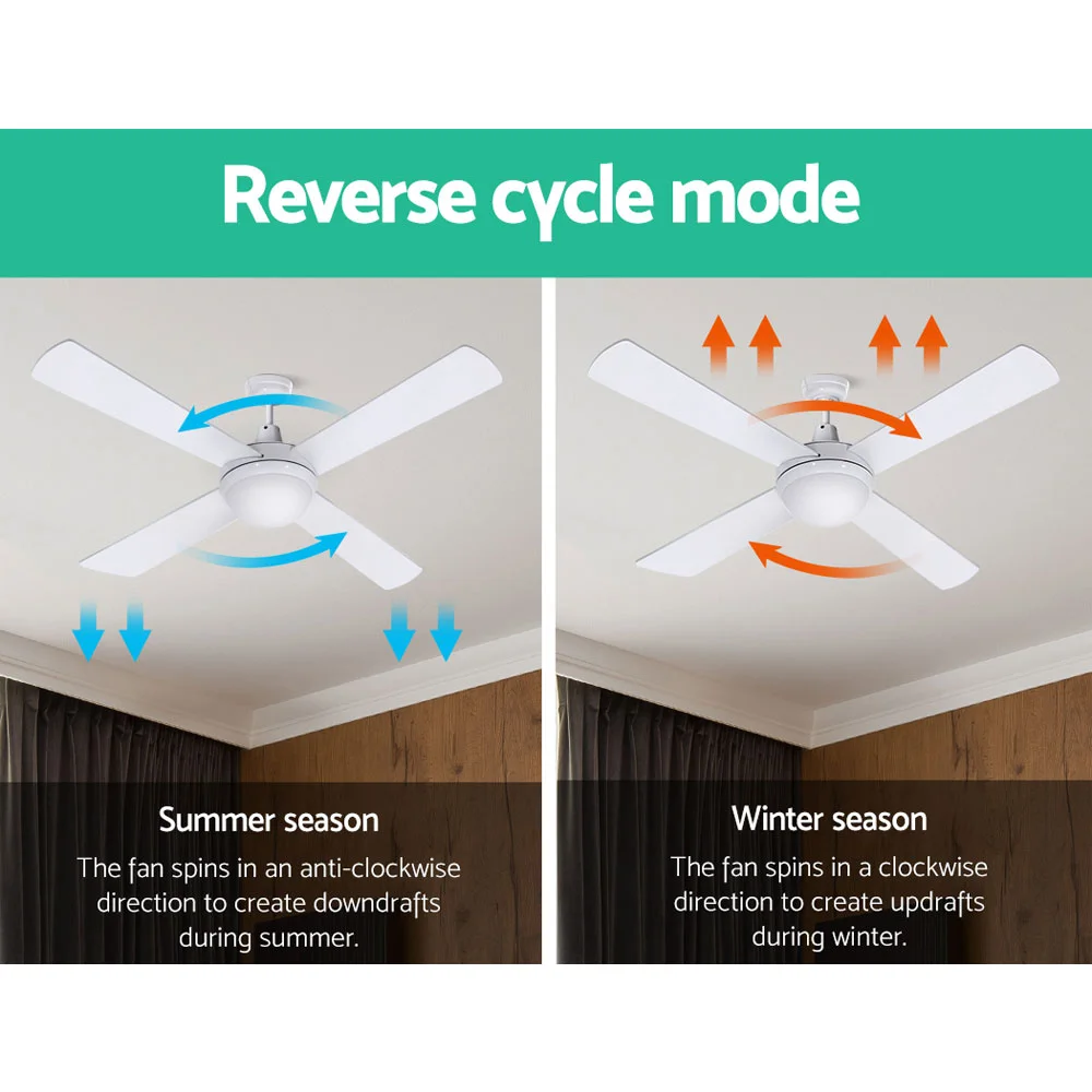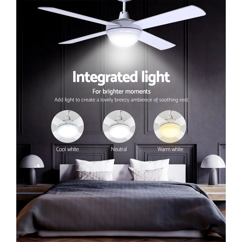 >Gentle breezes, light drafts or high winds, the Devanti 52" Ceiling Fan is ever ready to meet your requirements easily. With six fan speeds, the contemporary-design ceiling fan also has a reverse cycle motor that can create downdrafts during summer or updrafts during winter for greater comfort. Its four high-quality wooden blades are pitched at an airflow-inducing 12 degree for more effective wind creation. Plus, its energy-efficient 35W motor operates ever so quietly. Also featured is built-in memory-enabled LED lighting that can bring on a cool white, warm white or neutral lighting ambience to go with the fanning function. Better still, the fan can be set for up to 8 hours of timed operation and the handy remote control makes this fan a breeze to use from anywhere in the room. The ceiling fan also comes with all the accessories for an easy installation including an extension rod. Available in black, white or silver colour to match your decoration easily.