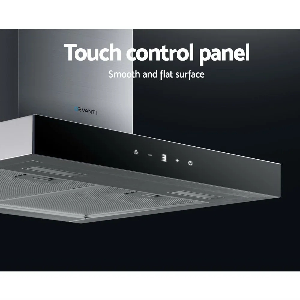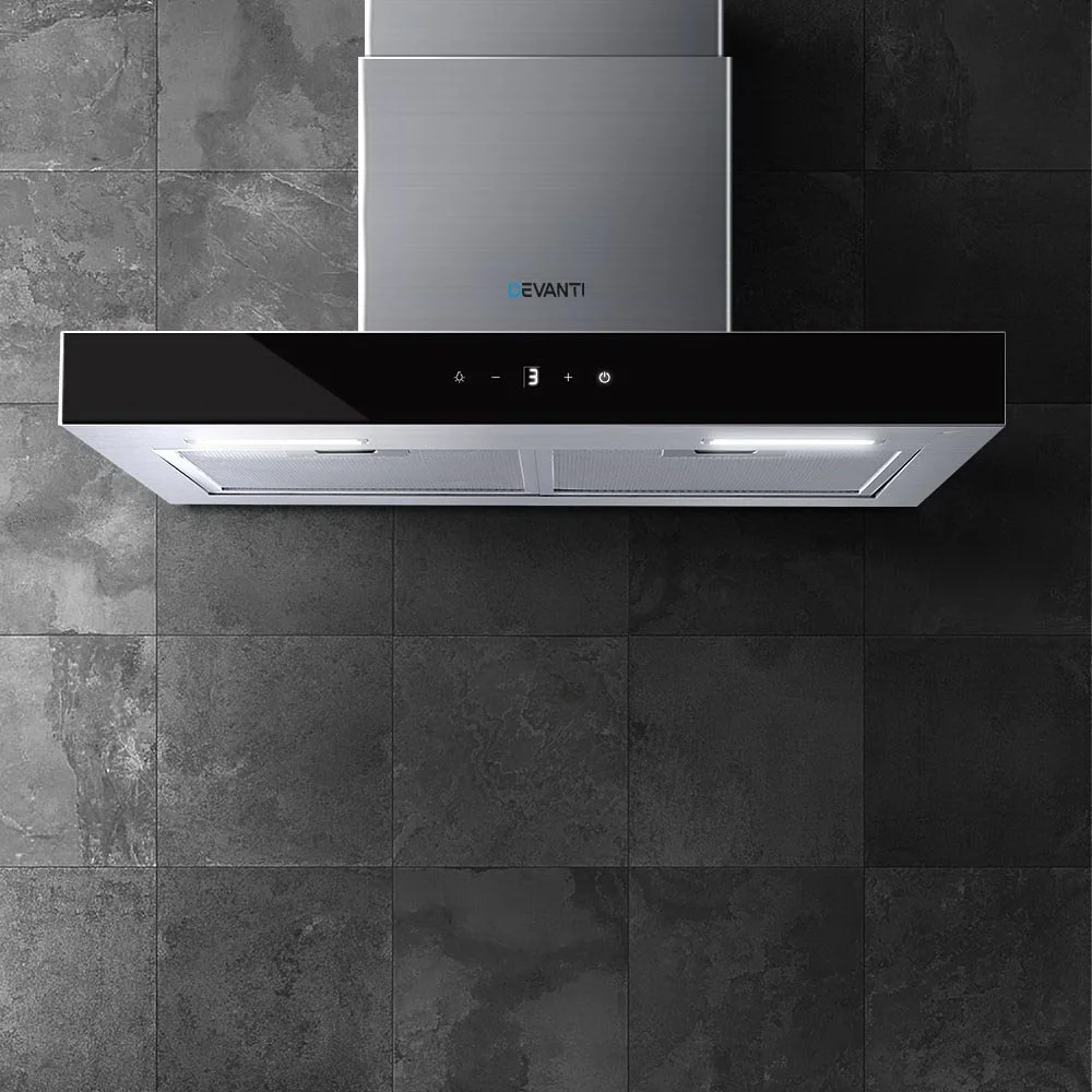 Say goodbye to smoky fumes and unwelcome cooking odours with our Devanti Range Hood featuring an elegant black tempered glass body that looks as good as it functions. With its high-performance motors, the range hood provides a steady upflow and filtered extraction of fumes and oil to keep your cooktop area clean and fresh after every use. With its 3-speed touch controls, the extraction speed can be adjusted to suit the circumstances. Other features include non-stick 5-layer aluminium filters that are removable and replaceable and two bright LED lamps to facilitate your illuminated cooking. The range hood is wall mounted and the chimney can be adjusted to fit the installation space.