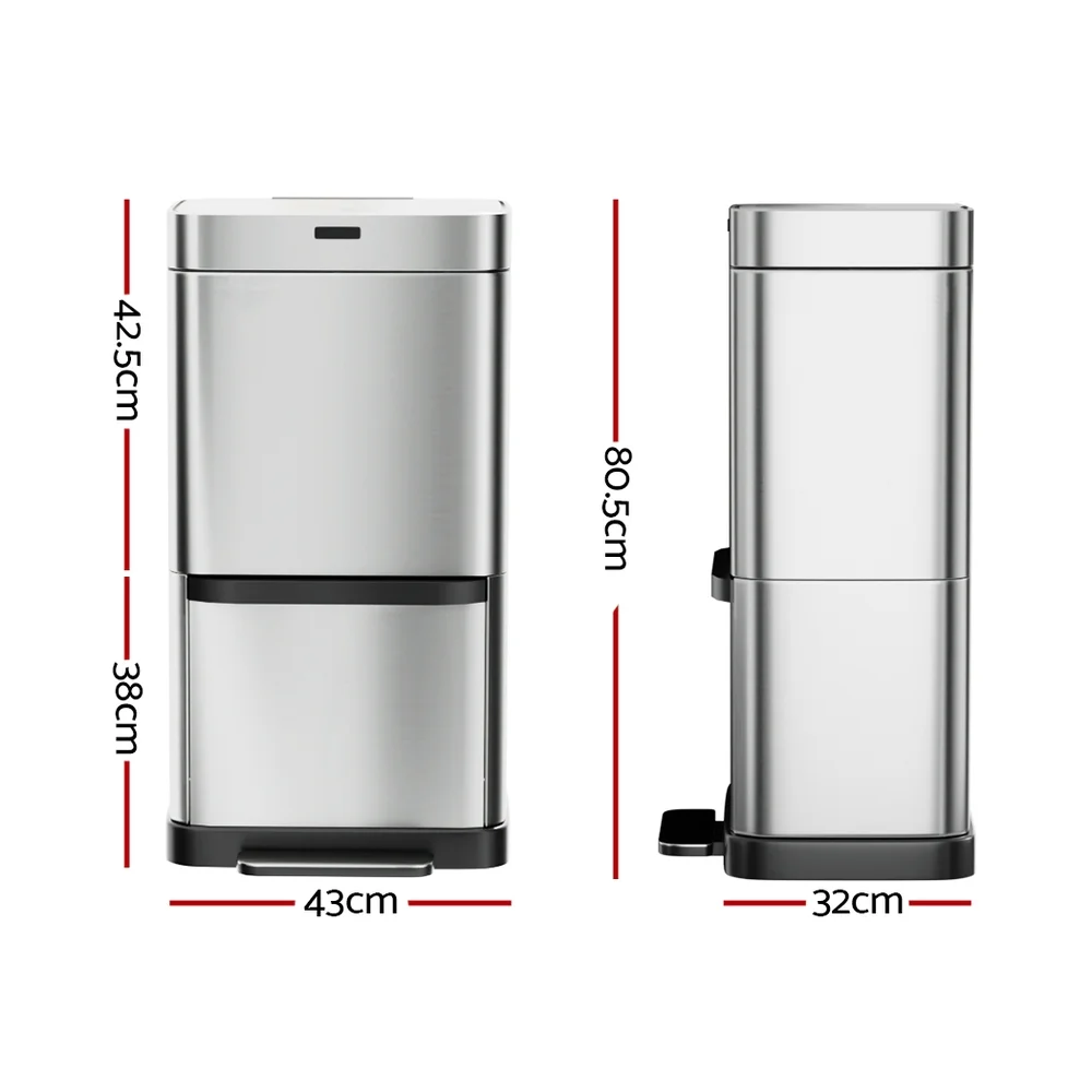 Keep your home clean, tidy and germ-free with a Devanti Recycling Motion Sensor Bin. Activated by just the wave of your hand (within a 20cm range) and a hands-free foot pedal, the motion sensor bin makes it easy to dispose of your trash cleanly and hygienically. With a large 70L capacity, you won't need to clear your bin immediately to make room for more trash. The bin is divided into two compartments so you can dispose of your trash and recycling separately. A removable divider for the top compartment helps keep your different recycling needs separate. A fingerprint-resistant black surface keeps your kitchen looking shiny and bright. No more worrying about the bin liner moving out of position with the convenient liner holder. The soft opening and closing make the bin completely noise-free. Keep your home (and the planet) clean and clear with a Recycling Motion Sensor Bin from Devanti.