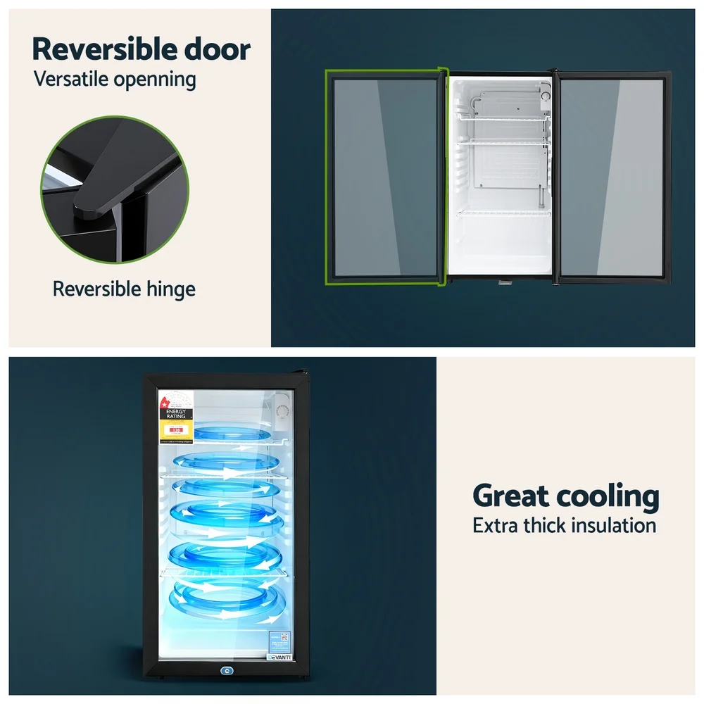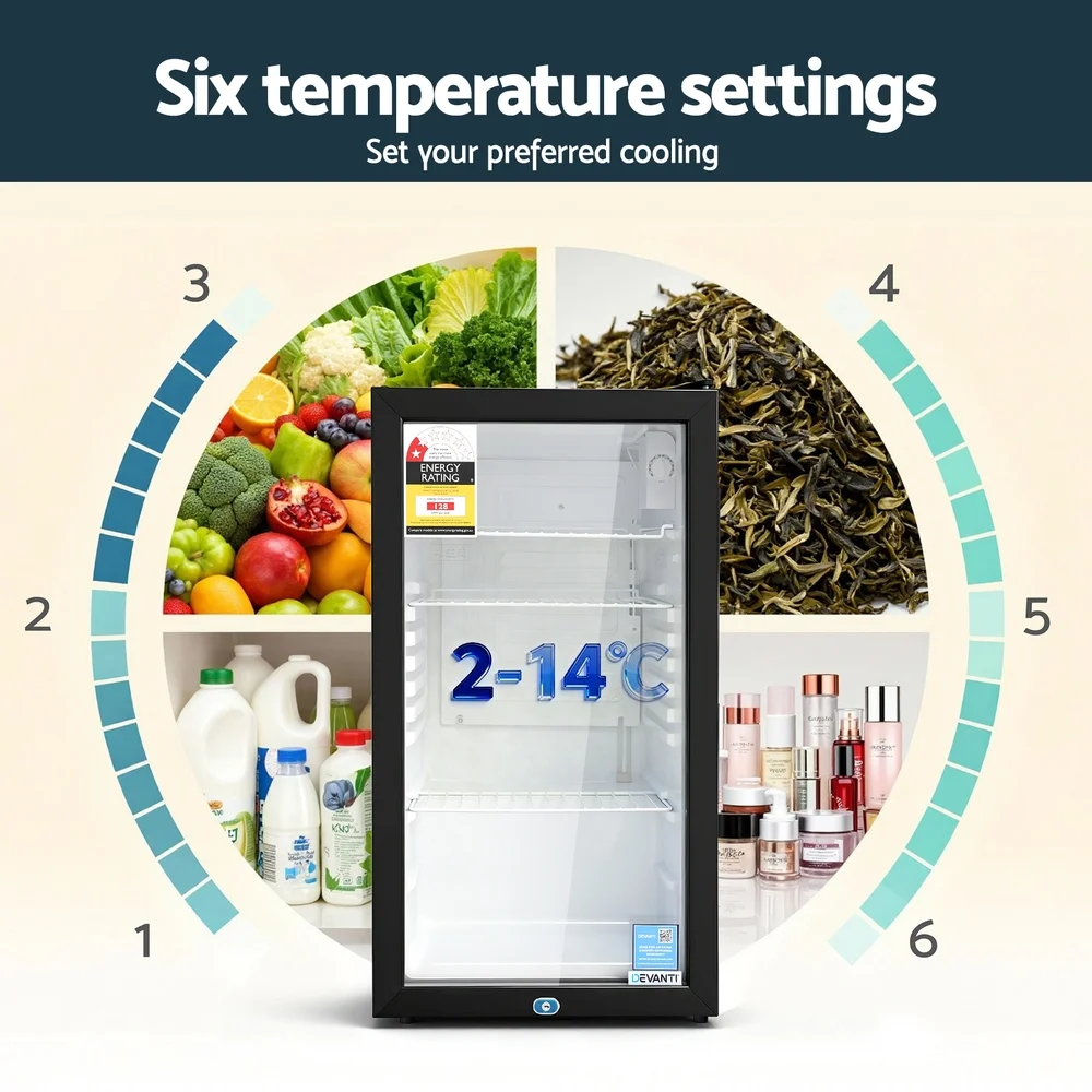 Our portable Devanti Bar Fridge is great for keeping a variety of food and beverages chilled and cooled without taking up too much space. Designed with six temperature settings, the energy-efficient bar fridge lets you set your desired coolness and freshness. Other great features include adjustable shelves, double-glazed door, height-adjustable feet, built-in handle and consistent refrigeration to name a few. The compact bar fridge is well-made for robust use, such as the extra thick insulation and a built-in LED lamp to ensure operation is smooth, quiet and hassle-free. The fridge also comes with a built-in lock to keep the contents safe and secure, especially useful in a retail environment after you close for the night. Suitable for both domestic and commercial use, the Devanti bar fridge is a cool investment time and again.