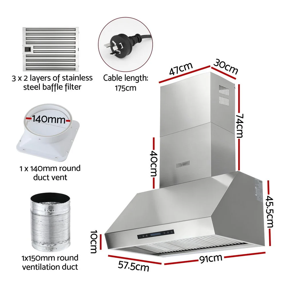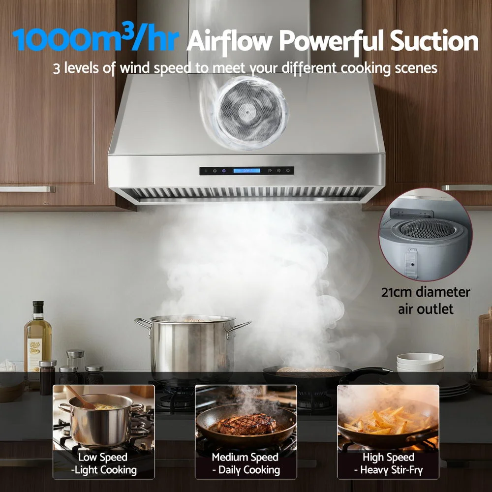Upgrade your kitchen with the Devanti 90cm Wall-Mounted Range Hood, designed to deliver powerful 1000m?/hr suction and a quiet, efficient cooking experience. Built with durable stainless steel, this range hood is both long-lasting and stylish, great for complementing any modern kitchen.