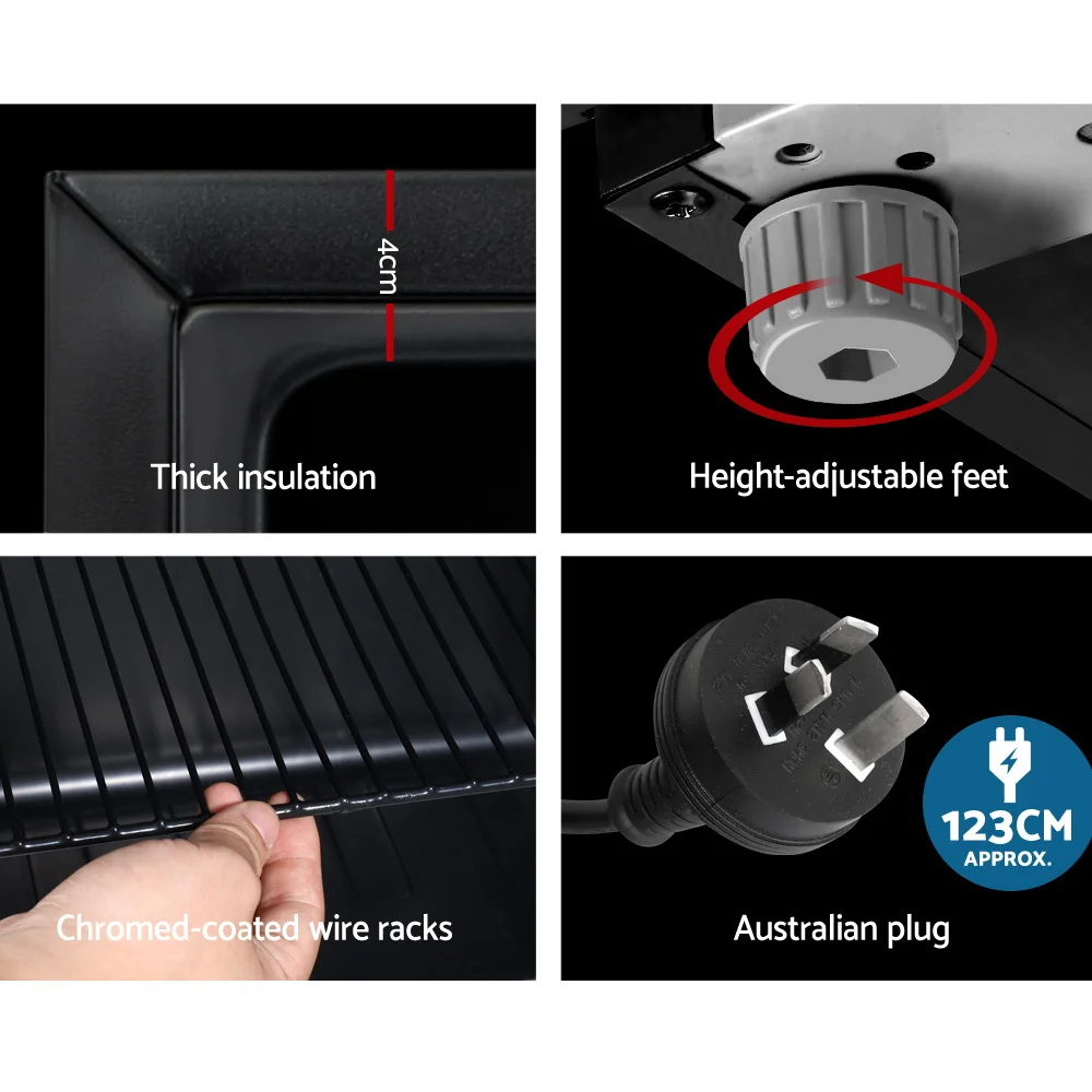 Our portable Devanti Bar Fridge is great for keeping a variety of food and beverages chilled and cooled without taking up too much space. Designed with seven temperature settings, the energy-efficient bar fridge lets you set your desired coolness and freshness. Other great features include adjustable shelves, double-glazed door, height-adjustable feet, built-in handle and consistent refrigeration to name a few. The compact bar fridge is also totally eco-friendly with its R600a freon-free refrigerant and well-made for robust use, such as the extra thick insulation and a built-in LED lamp to ensure operation is smooth, quiet and hassle-free. The fridge also comes with a built-in lock to keep the contents safe and secure, especially useful in a retail environment after you close for the night. Suitable for both domestic and commercial use, the Devanti bar fridge is a cool investment time and again.