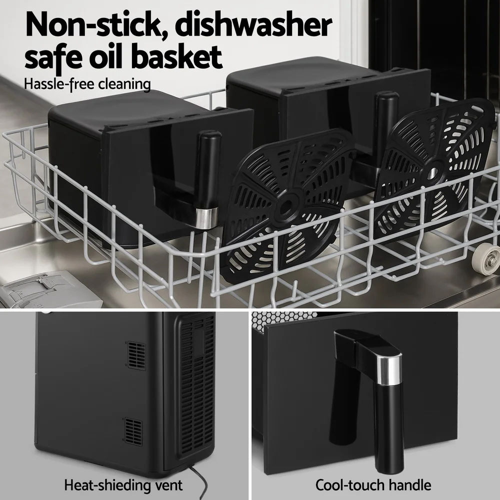 This 11L large-capacity dual-zone air fryer features two independent 5.5L baskets, allowing you to cook different foods simultaneously without flavor transfer! Fry chips, roast wings, reheat pizza, or dehydrate fruits—separate temperature control saves time and meets the whole family's diverse needs.The best part is that the Devanti air fryer heats food at all directions and most of the ingredients do not need any oil.