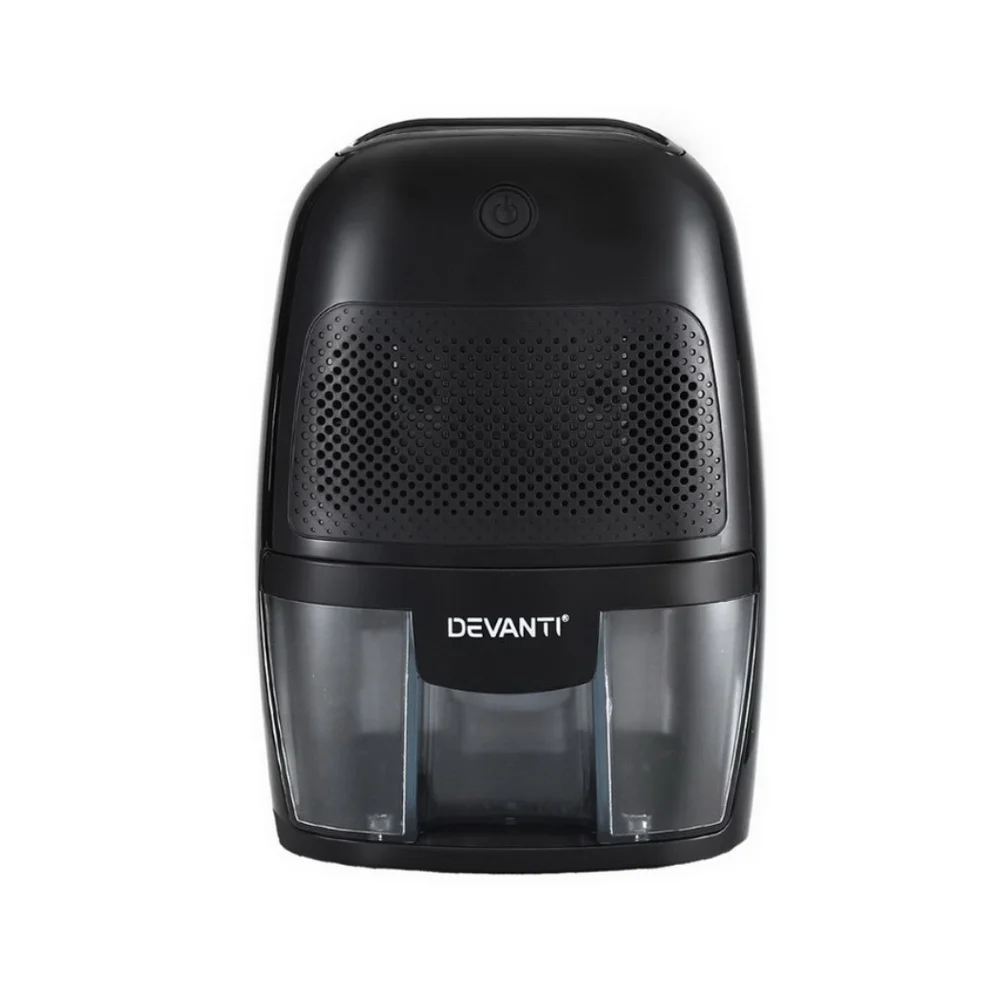 The Devanti Mini Dehumidifier uses Peltier technology for quiet operation (<48dB), removing approx. 250–300ml of moisture daily. Compact (15.4x13x21.8cm) and lightweight (1kg), it includes a 600ml tank with auto shut-off and red LED alert when full. Ideal for home, office, or dorm. The product is free from harmful substances, ensuring safe use. It also features a detachable tank cover for easy cleaning.