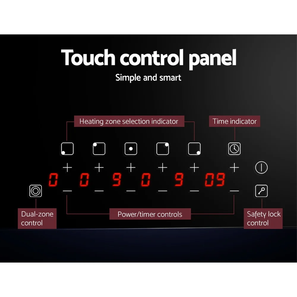 Whether it is for your existing or new home, our Devanti 90cm Ceramic Cooktop is just the thing you need for easy, no-fuss cooking. Loaded with an extensive list of chef-friendly features such as high wattage cooking zones, touch control and LED display panel, independent 99-min timers, overheat protection and efficient heat dissipation, this cooktop is also incredibly sleek with its high-grade black ceramic glass plate. It features six cooking zones (or five including one dual-ring) with nine power levels to choose from to prepare that perfect dish. Plus, the residual heat indicator also helps to tell when it is safe to touch the cooktop after turning the hot plates off. Better still, the cooktop will turn itself off when temperatures get excessively high or you simply forget to turn it off after your cooking. Powerful and yet integrally safe, the cooktop promises many moments of hassle-free delicious cooking with the right blend of sophistication and class for your kitchen.