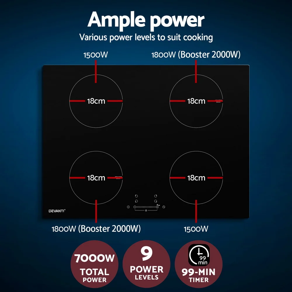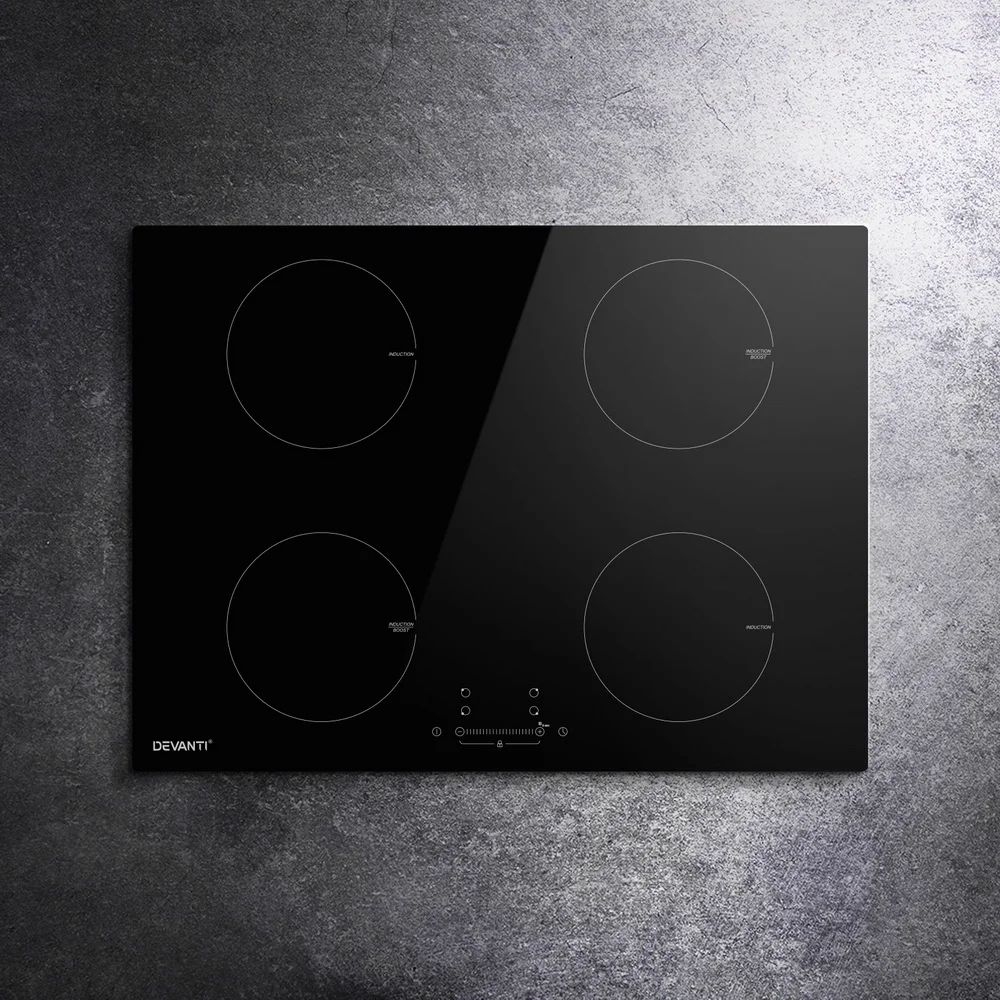 Whether it is for your existing or new home, the Devanti 70cm Induction Cooktop is just the thing you need for easy, no-fuss cooking. Loaded with an extensive list of chef-friendly features such as four high-wattage cooking zones, touch control and LED display panel, independent 99-min timers, overheat protection and efficient heat dissipation, this cooktop is also incredibly sleek with its high-grade black ceramic glass plate. It features nine power levels to choose from to prepare that perfect dish. Plus, the residual heat indicator also helps to tell when it is safe to touch the cooktop after turning the hot plates off, and a child safety lock prevents accidental usage. Better still, the cooktop will turn itself off when temperatures get excessively high, or you simply forget to turn it off after your cooking. Powerful and yet integrally safe, the cooktop promises many moments of hassle-free delicious cooking with the right blend of sophistication and class for your kitchen.