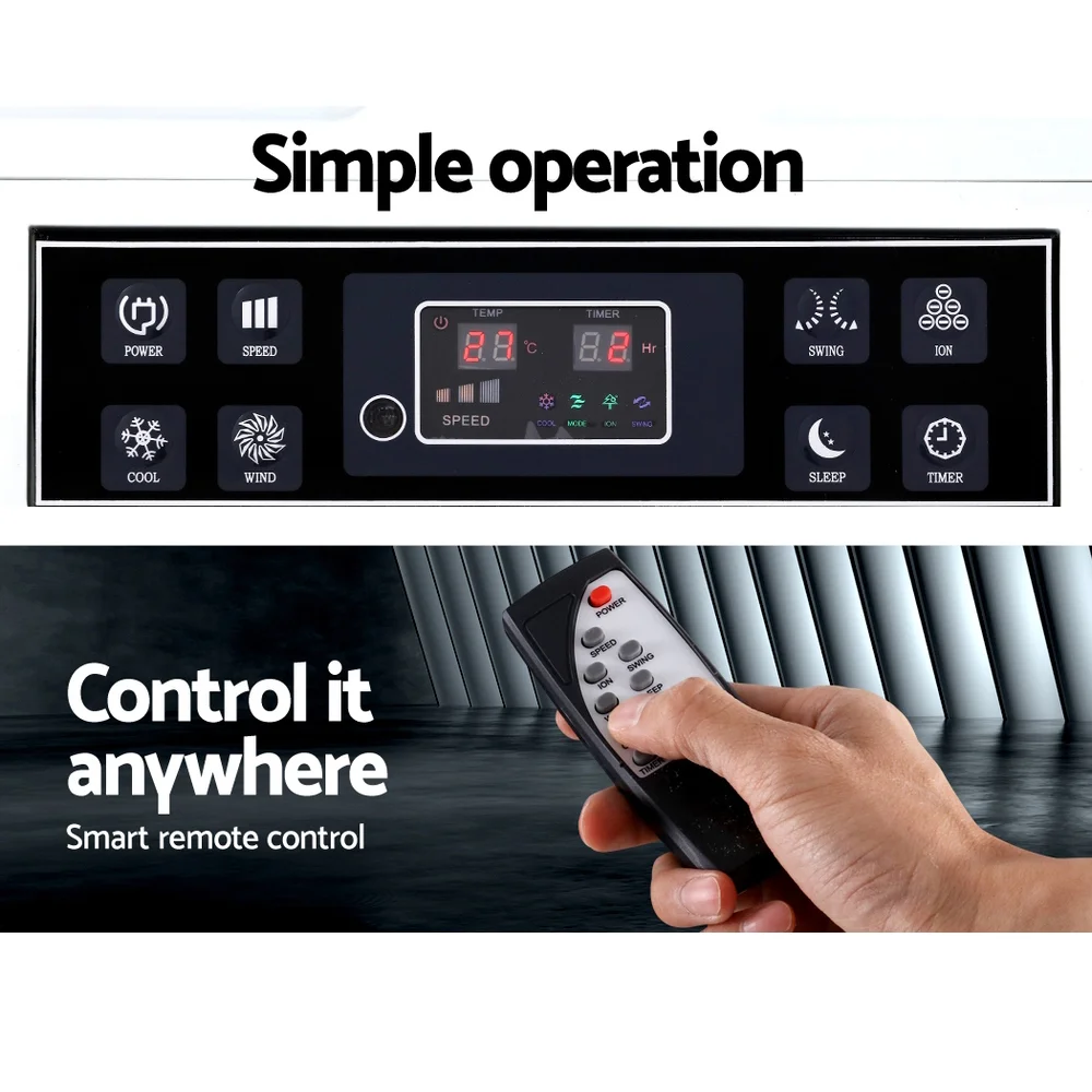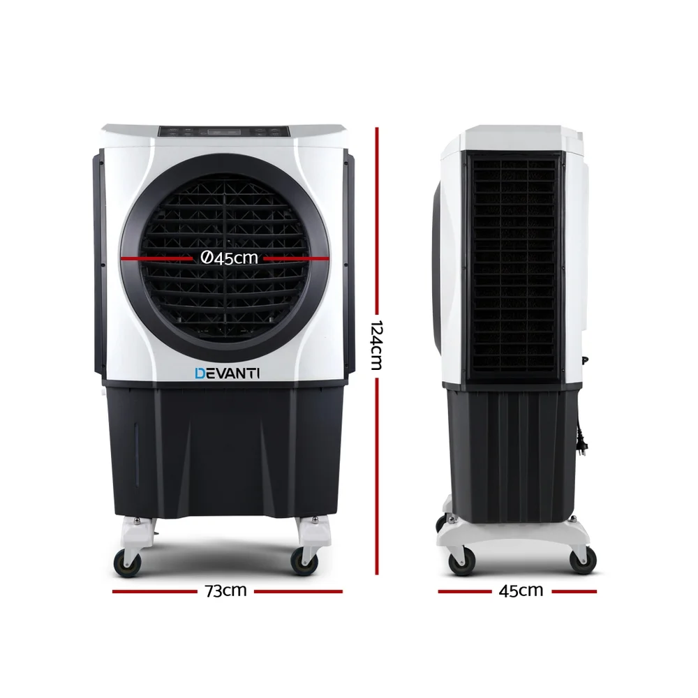 Our Devanti Evaporative Air Cooler is a monster of an air cooler. It has a huge 60L water tank so that you can keep cool for hours without having to top up the water often. You can also add ice to the cooler for more efficient cooling. The placement of water filters on three sides and the whirlwind airflow of up to 5,000m³/h allows the cooler to rapidly deliver super cool breezes throughout rooms as large as 50m² with its adjustable louvres and automatic swing mode. The removable dust filter effectively eliminates all pollutants such as dust, pollen, cigarette smoke, bacteria and odours, to deliver purified air. The evaporative air cooler utilises a 3-speed fan with three working modes (normal, natural and sleep), and is fitted with four lockable castor wheels for easy mobility. Not least, the LED digital control panel enables easy operation, with a remote control included for extra convenience.