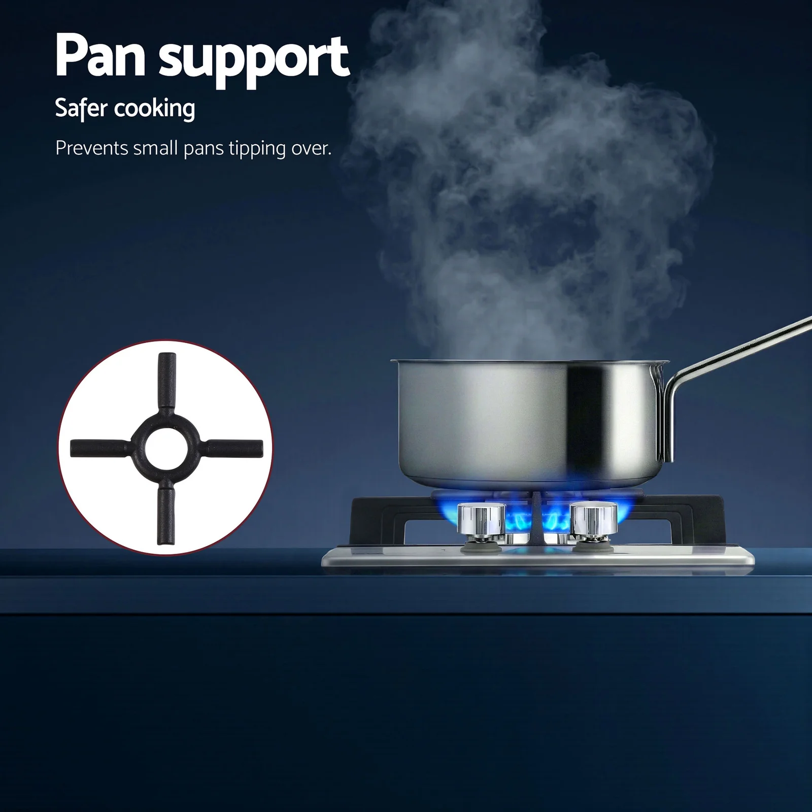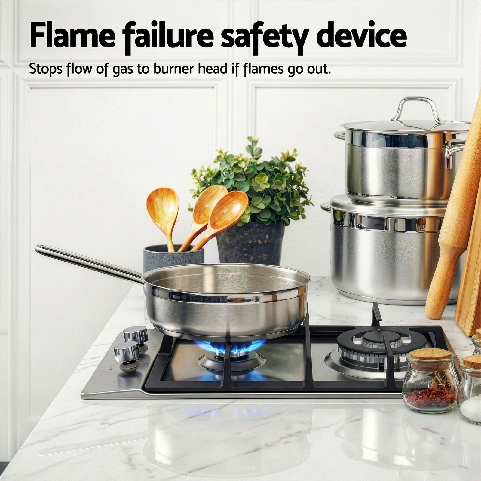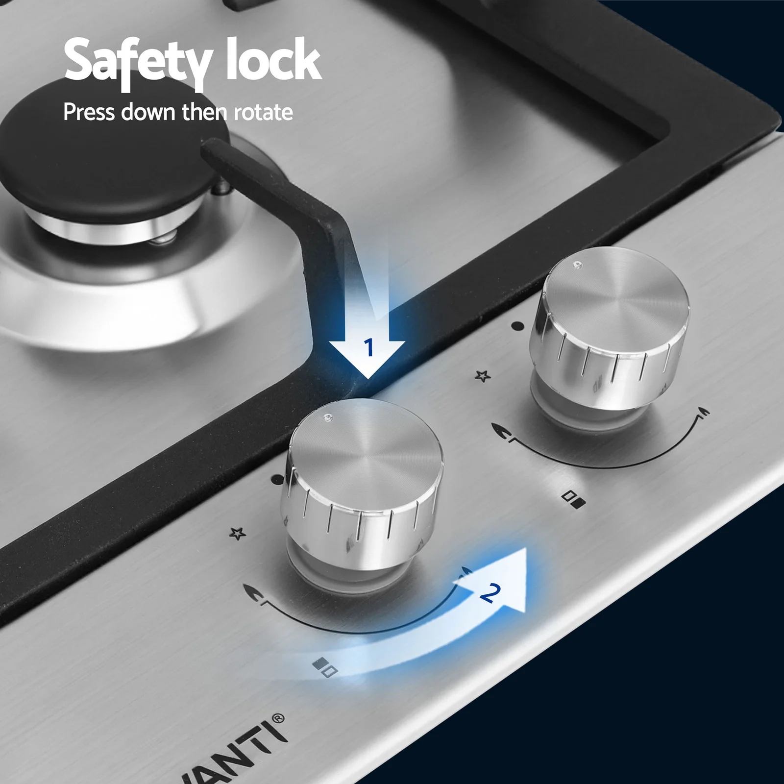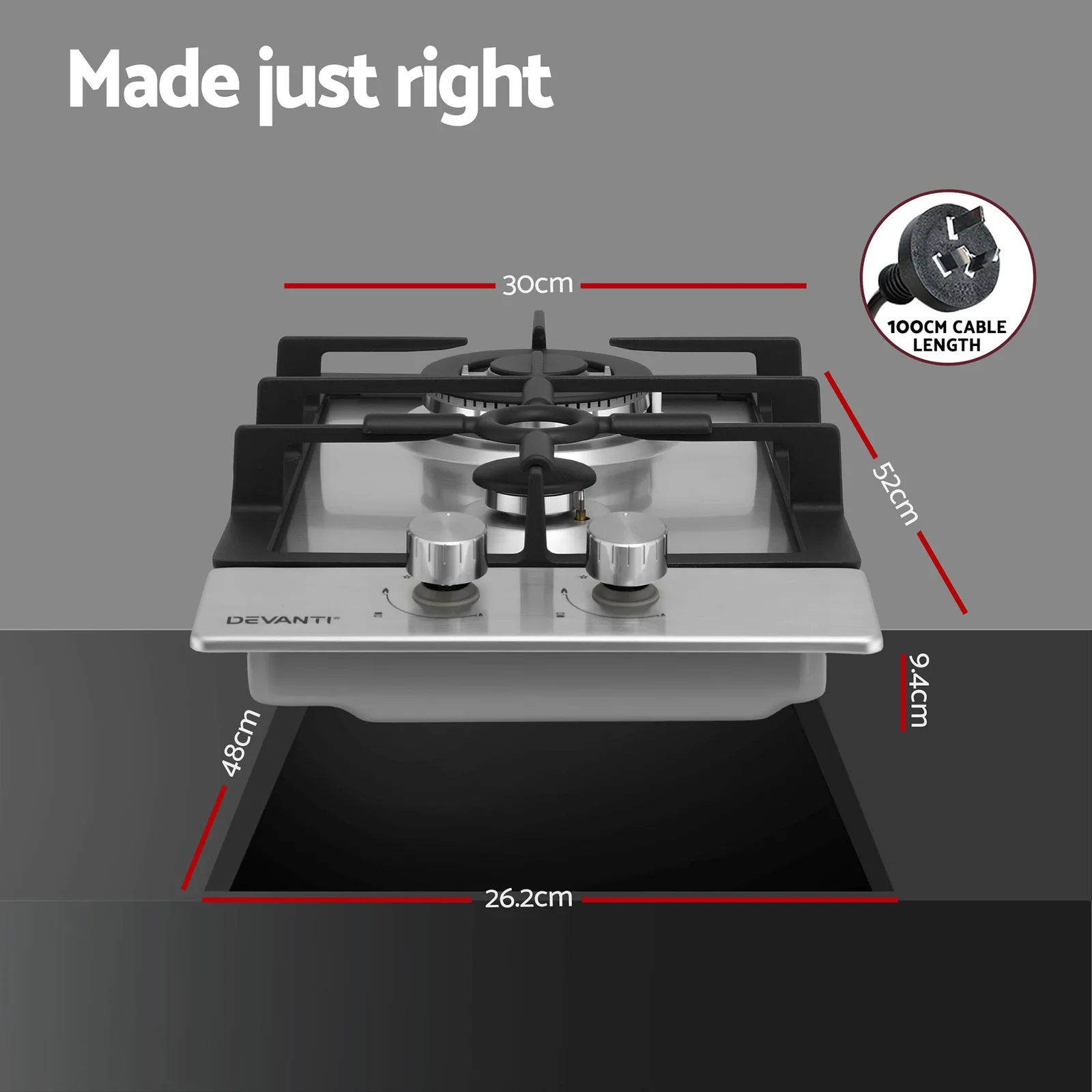 The Devanti 30cm Gas Cooktop combines sleek stainless steel with robust cast iron grates for stable, heat-resistant cooking. Featuring a powerful wok burner and an auxiliary burner with pan support, it offers versatile power levels for any dish. Safety is built-in with a flame failure device, safety lock, and easy ignition system. Controlled by durable galvanized knobs, this unit is factory-set for Natural Gas but includes an LPG conversion kit. It's the perfect blend of style and safety for any modern kitchen, ensuring hassle-free performance every time.