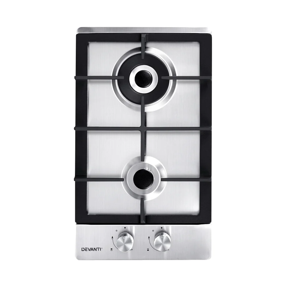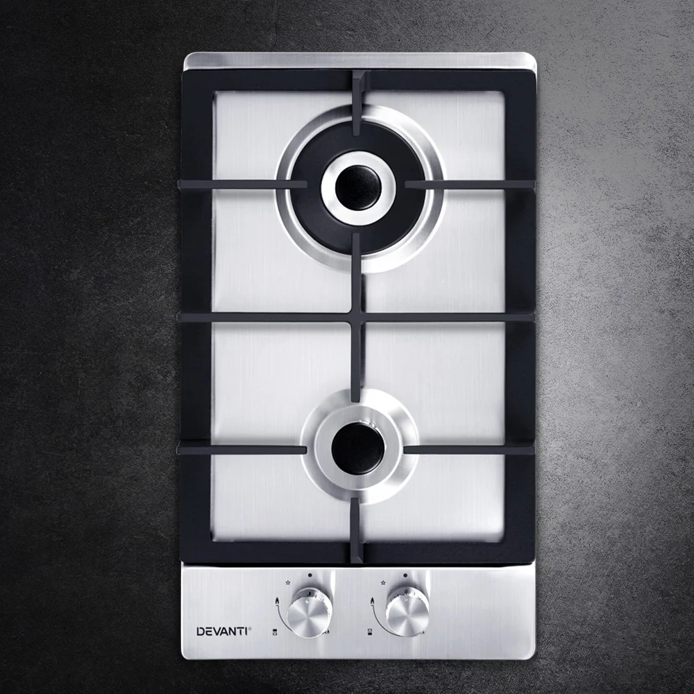 Whether it is for your existing or new home, our Devanti 30cm Gas Cooktop is just the right thing you need for easy, no-fuss cooking. Loaded with an extensive list of chef-friendly features such as an easy ignition system, easy-to-use galvanized knob controls with a safety lock and flame failure safety device, the cooktop is also incredibly sleek with its stainless steel surface. It features two burners, a wok burner and one auxiliary burner, with various power levels to choose from to prepare that perfect dish. The solid cast iron grates hold up your pots and pans perfectly steady and are longlasting and heat-resistant as well. And a pan support is included for use with the auxiliary burner to prevent tiny pans from tipping over and messing up your cooktop. The cooktop is factory set for natural gas but is compatible with LPG once the included LPG conversion kit is installed. Powerful and yet integrally safe, the cooktop promises many moments of hassle-free delicious cooking with the right blend of sophistication and class for your kitchen.