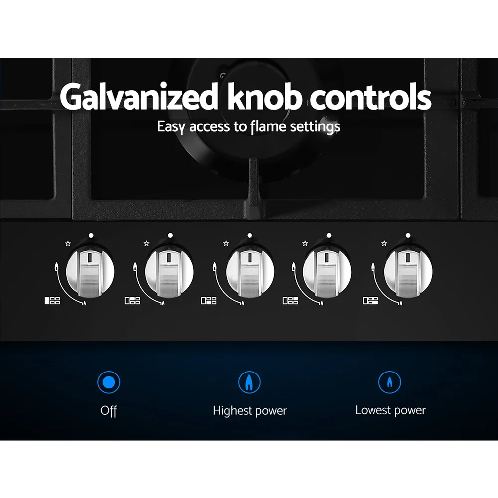 Whether it is for your existing or new home, our Devanti 90cm Gas Cooktop is just the right thing you need for easy, no-fuss cooking. Loaded with an extensive list of chef-friendly features such as an easy ignition system, easy-to-use galvanized knob controls with safety lock and a flame failure safety device, the cooktop is also incredibly sleek with its black tempered glass surface. It features five burners including two semi-rapid burners, one rapid burner, one wok burner and one auxiliary burner, all with various power levels to choose from to prepare that perfect dish. The solid cast iron grates hold up your pots and pans perfectly steady and are longlasting and heat-resistant as well. And a pan support is included for use with the auxiliary burner to prevent tiny pans from tipping over and messing up your cooktop. The cooktop is factory set for natural gas but is compatible with LPG once the included LPG conversion kit is installed. Powerful and yet integrally safe, the cooktop promises many moments of hassle-free delicious cooking with the right blend of sophistication and class for your kitchen.