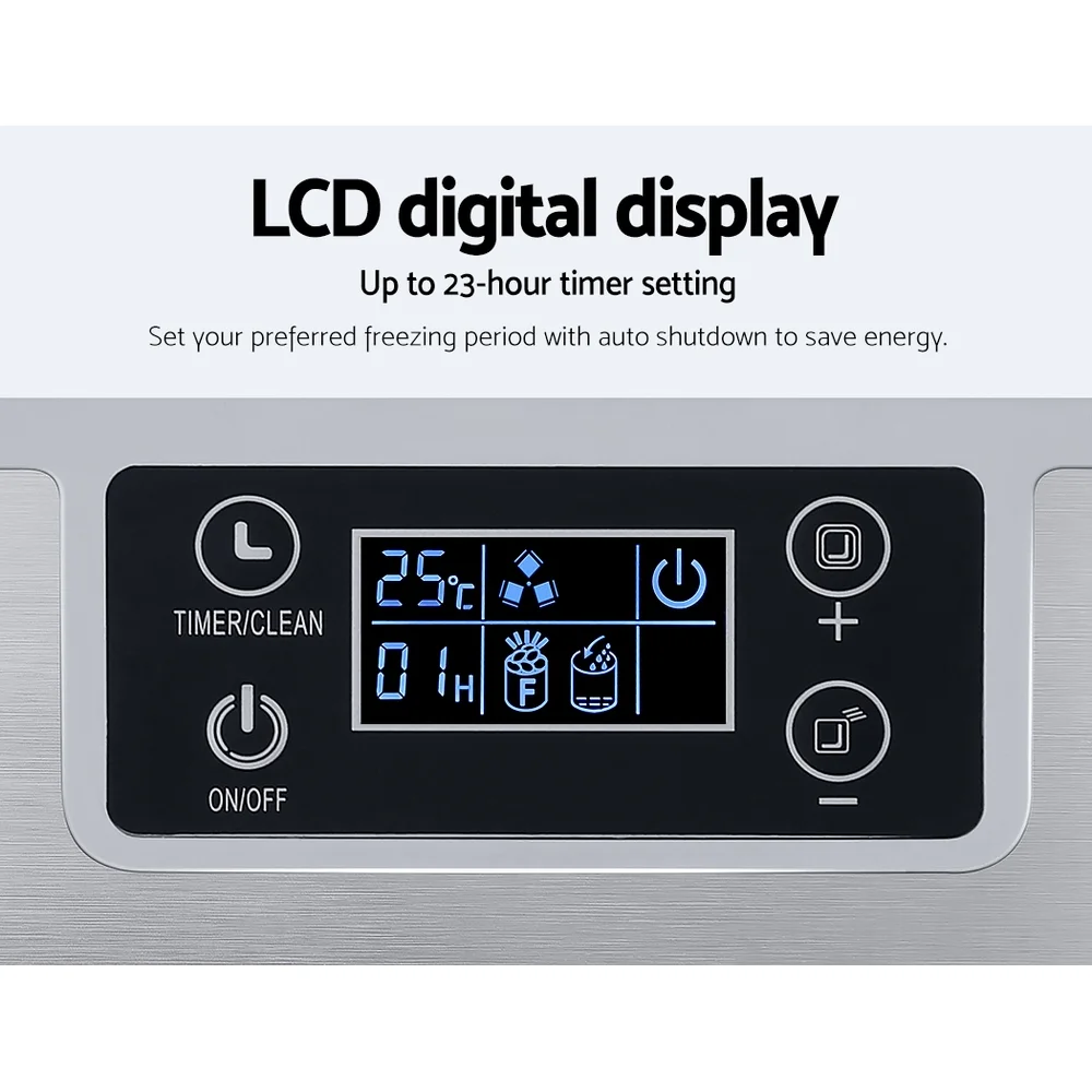 Looking for ice in a hurry? Meet our Devanti Ice Maker! Quickly produce 24 ice cubes in 14-19 minutes, with the flexibility to choose from 3 thickness. It's loaded with smart features like water shortage and ice full alarms, plus energy-saving technology through Freon-free refrigerant and enhanced heat dissipation. Its sleek, compact design fits anywhere, and with its easy-to-use controls, you’ll be enjoying cold beverages in no time. Ice at home has never been cooler!