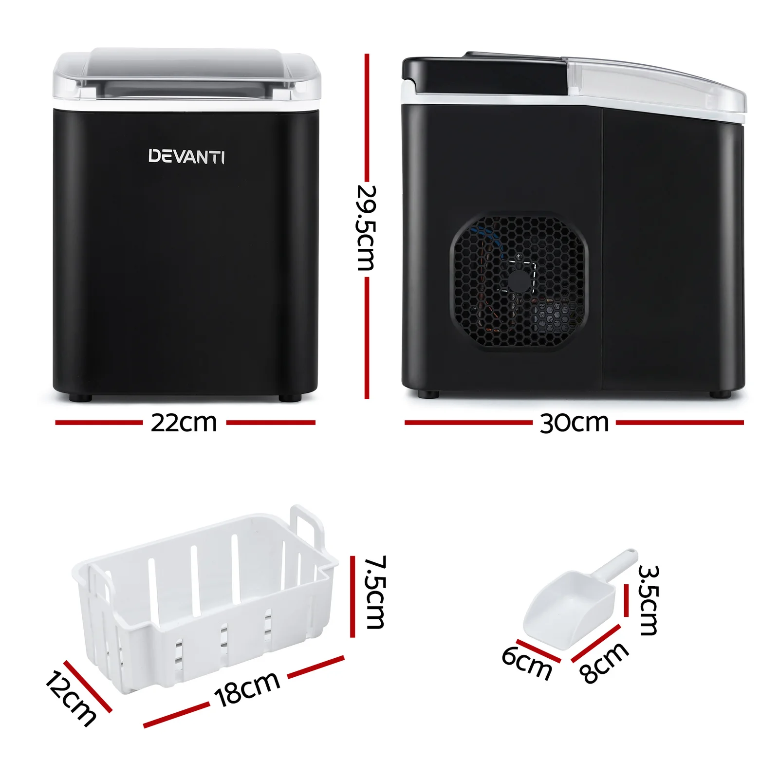 Enjoy instant ice anytime! The Devanti Portable Ice Maker produces 9 bullet-shaped cubes in just 6-7 minutes, up to 12kg daily. With self-cleaning, smart alarms, and quiet operation, this compact black machine fits perfectly in your kitchen or office. Includes scoop and basket - just plug in and enjoy chilled drinks all day!