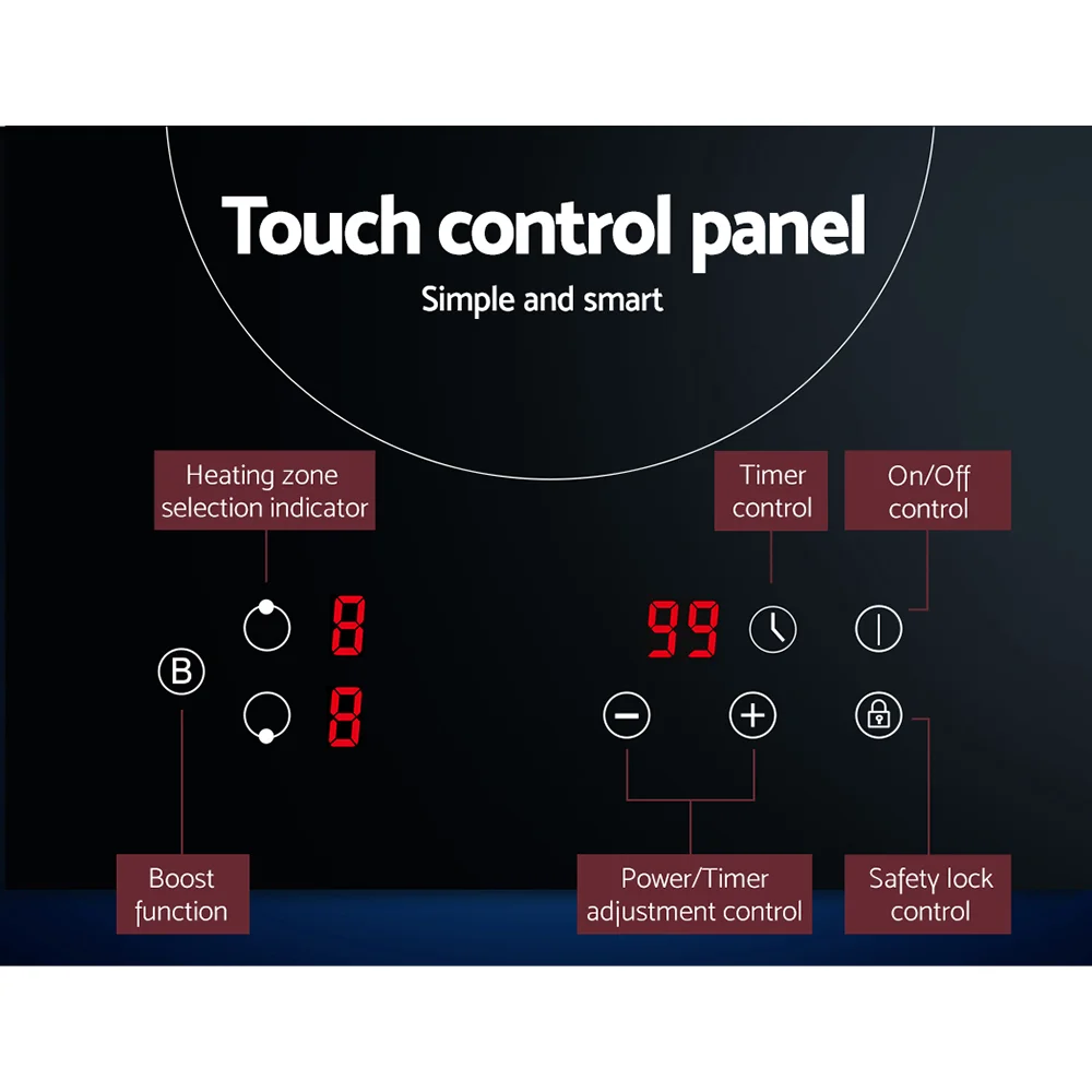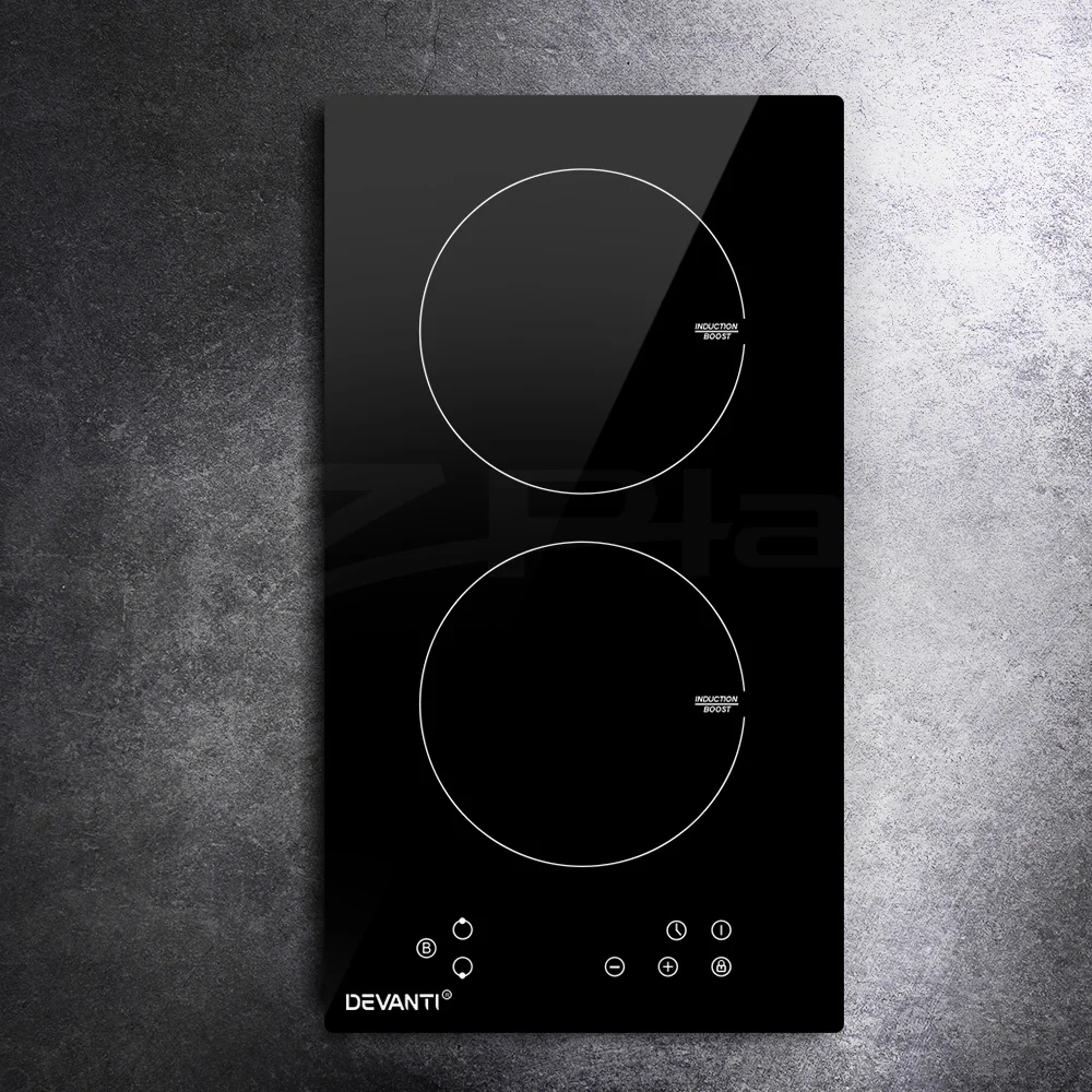 Whether it is for your existing or new home, the Devanti 30cm Induction Cooktop is just the thing you need for easy, no-fuss cooking. The cooktop is loaded with an extensive list of chef-friendly features such as two high-wattage cooking zones, touch controls, an LED display panel, independent 99-min timers, overheat protection and efficient heat dissipation. It is also incredibly sleek with its high-grade black ceramic glass plate. It features nine power levels to choose from to prepare that perfect dish. Plus, the residual heat indicator also helps to tell when it is safe to touch the cooktop after turning the hot plates off, and a child safety lock prevents accidental use. Better still, the cooktop will turn itself off when temperatures get excessively high, or you simply forget to turn it off after your cooking. Powerful and yet integrally safe, the cooktop promises many moments of hassle-free delicious cooking with the right blend of sophistication and class for your kitchen.