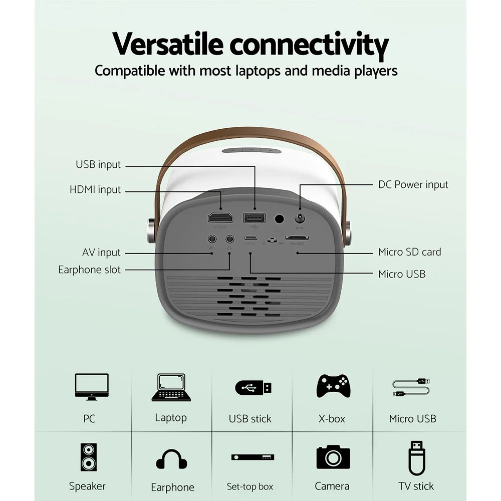 From the small screen to the big screen, now you can enjoy epic entertainment with our Devanti Video Projector. With its ultra-expansive colour gamut, the projector delivers crisp clear images with more brilliant colours to give you the best projection experience. The projector is compatible up to 1080p, so you won’t have to compromise on quality. Using Wi-Fi connectivity, our video projector effortlessly supports screen casting from your iPhone, iPad, smartphone, tablet or laptop, So you can stream content cable free. It also features a built-in heavy bass speaker and a high-lumens lamp with a lifespan of up to 30,000 hours. For even more entertainment value, the projector includes HDMI, USB, AV and 3.5mm audio ports for fast connection to multiple devices such as external speakers, game consoles and hard disks. Get the home cinema experience and order today! Include remote control and additional AV audio cable.