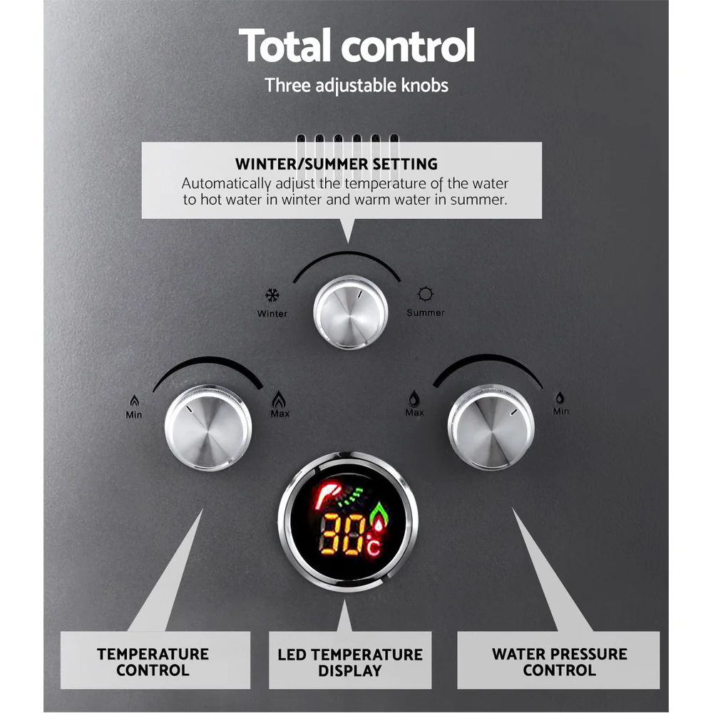 Easy to install, the Water Heater can heat up to 360L of water per hour at your preferred temperature setting conveniently shown on the LED display. No worries about getting accidentally scalded too as the Heater has a built-in processor. Together with a host of other great safety features, the variable flow shower head is also designed to automatically ignite or turn off the burner by a simple on/off trigger.