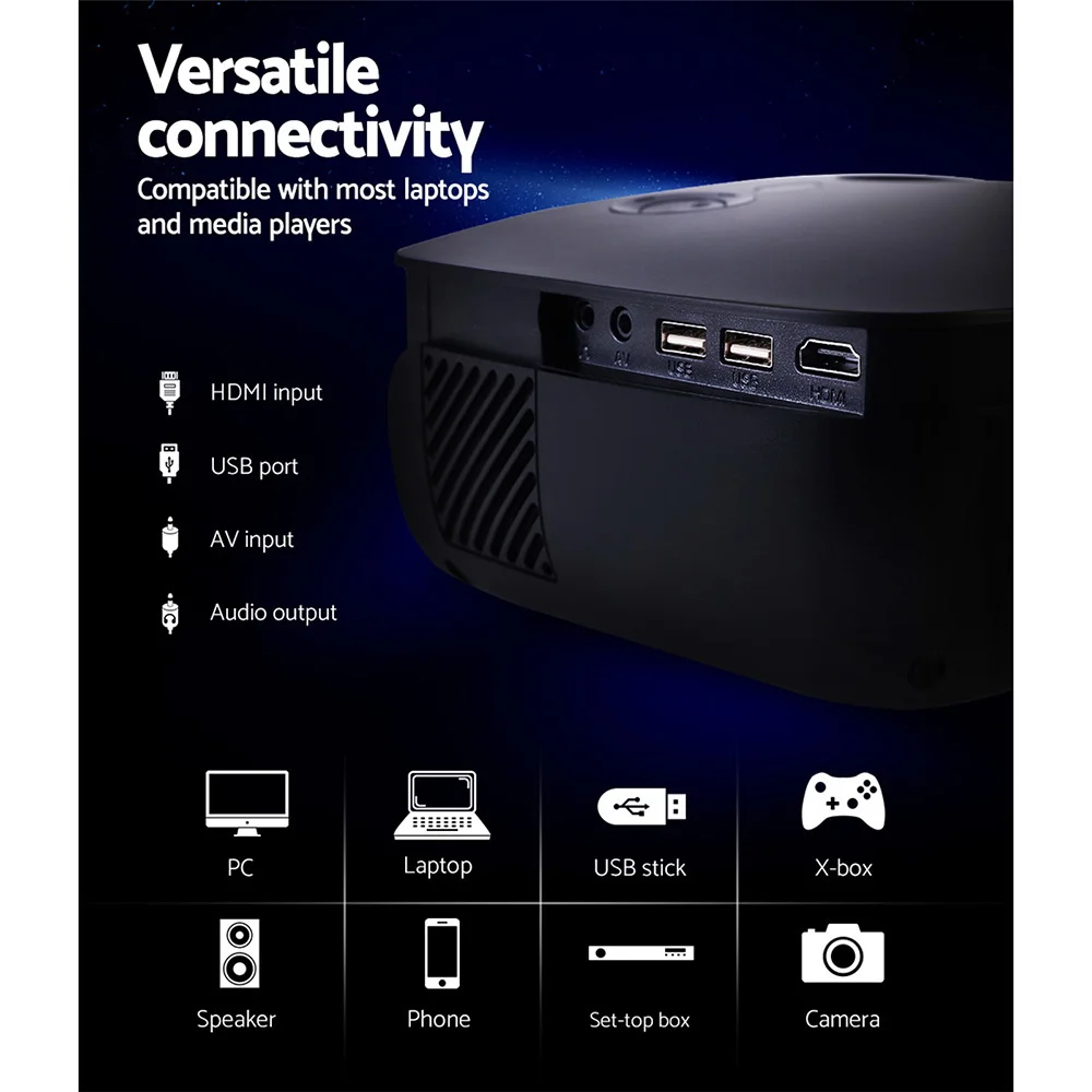 Enjoy epic entertainment with our Devanti Video Projector. From your small screen to the big screen. Using Wi-Fi connectivity, our video projector effortlessly supports screen cast from your iPhone, iPad, smartphone, tablet and laptop, to stream contents to the projector screen without any need of a dongle, adaptor or other cables. And with its ultra-expansive colour gamut, the projector delivers crisp clear images with more brilliant colours and is fully HD 1080P compatible. It also features a built-in heavy bass speaker and a high-lumens lamp with a long lifespan of up to 50,000 hours. Best of all, you get a wide screen experience from a relatively short projection distance. Not least, you have HDMI, USB, AV and 3.5mm audio ports for fast connection to multiple devices such as external speakers, game consoles and hard disks. A remote control and bonus AV audio cable are also included.