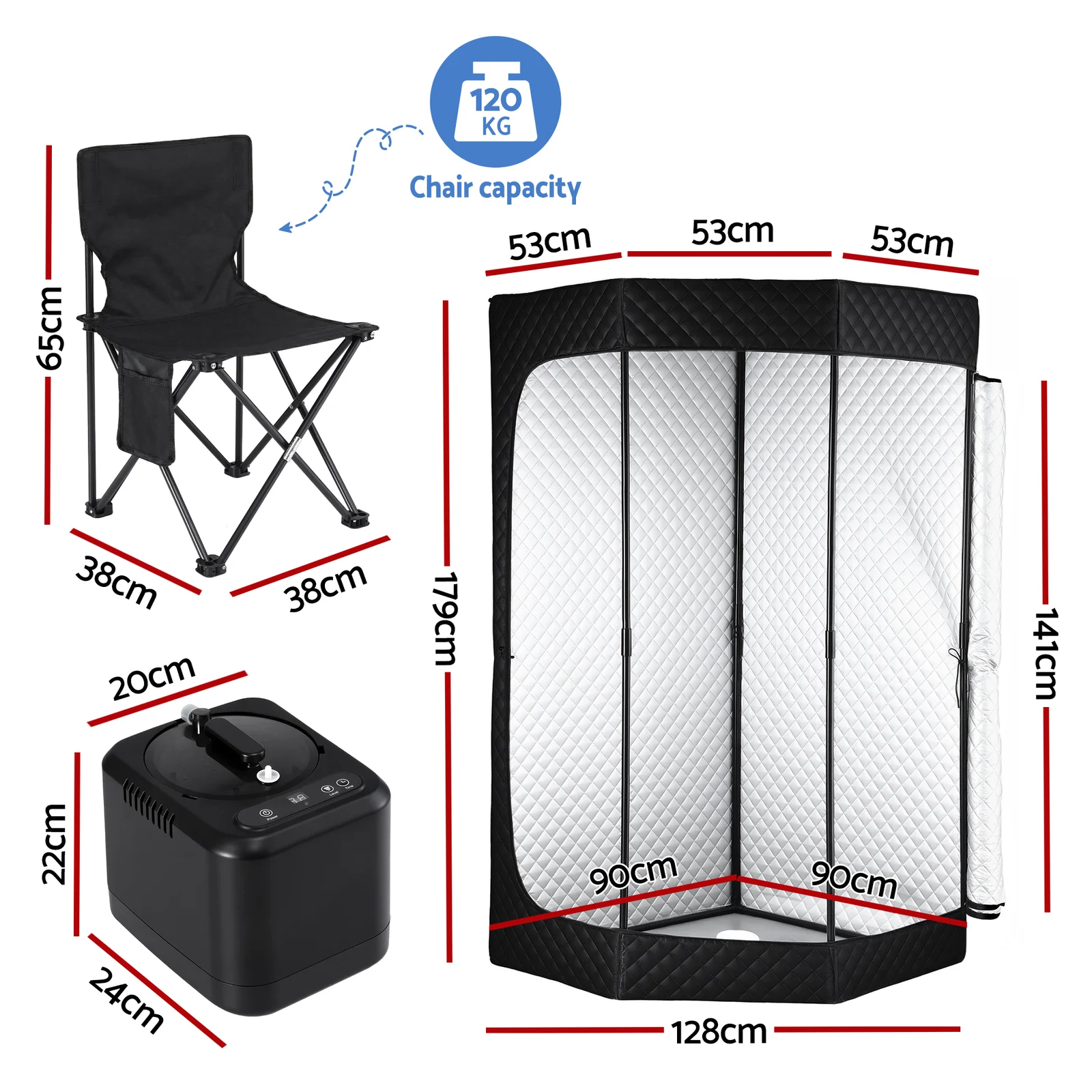 Elevate your self-care routine with our portable personal steam sauna! SAA-certified for safety, it features a 3L steam pot with overheat protection, ensuring a worry-free home spa experience. The 9-level temperature control (up to 54℃) and 10-60 minute smart timer allow you to customise your relaxation. Crafted with a durable 304 stainless steel liner and equipped with UV atomization, this sauna delivers efficient, hygienic steam sessions. Its solid metal frame, double-sided zip, and side pocket for phone storage add convenience. Plus, the foldable chair, floor mat, and tool-free assembly make it perfect for any space. Enjoy rejuvenating steam therapy at home today!