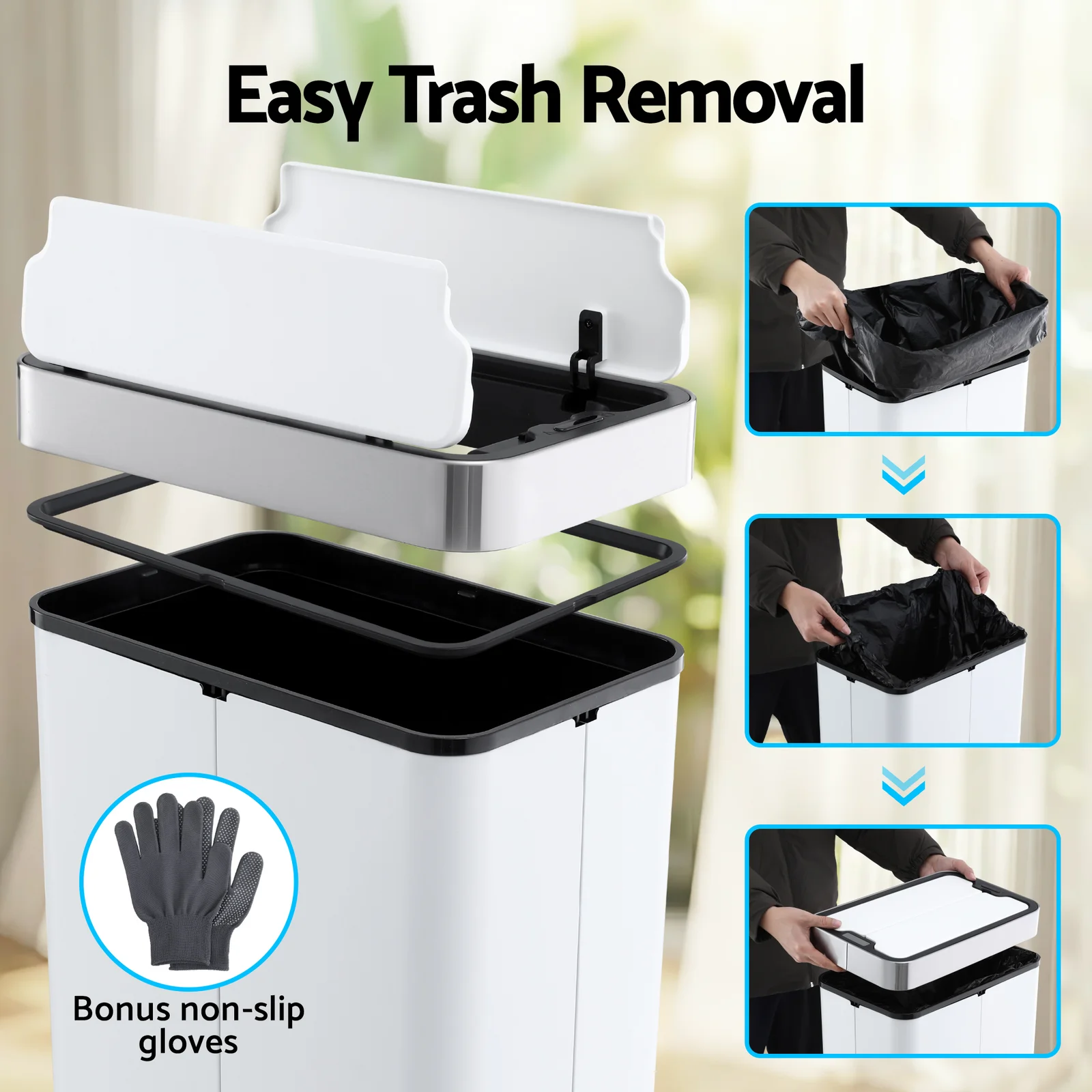 Hands-free operation opens the lid at 15–25 cm and closes after 5 seconds, with manual buttons for control. The dual wing lid fits under low benches, soft-close lid lowers quietly, and built-in bag holder keeps liners secure. Durable ABS body with stainless steel frame makes this kitchen rubbish bin practical and convenient for busy homes.