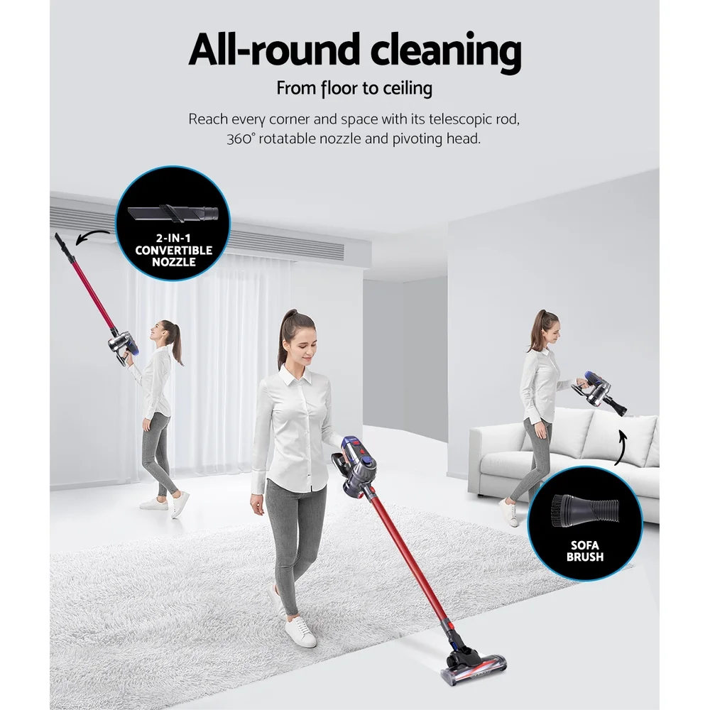 For the ultimate in easy vacuuming, our Devanti Handheld Vacuum Cleaner always makes for efficient cleaning. Its 160° pivoting head tilts and swivels, while the long-reach neck can get to those hard-to-reach spaces. It features a soft roller brush that is easy on floors, and hard on dirt. Fit with the included brush or crevice nozzles for every time of surface, nook or cranny. Run continuously for 20-35 minutes at a powerful 150W with 10,000pa suction power and 2 cleaning speeds. The one-handed design is lightweight and bagless, making it perfect for cleaning shelves, curtains, cars or other awkward niches. All collected dirt and debris pass through a washable and reusable HEPA filter that eliminates up to 99.97% of dust and allergens. Your purchase includes wall mounting accessories so you can store it easily and out of the way, and three filter replacements. Other features include an LED headlight to accurately spot dust, a one-click design to empty the dust container, and a quick charging 2000mAh Li-ion battery. Join the cleaning revolution and enjoy hassle-free vacuuming with a Devanti Handheld Vacuum Cleaner.