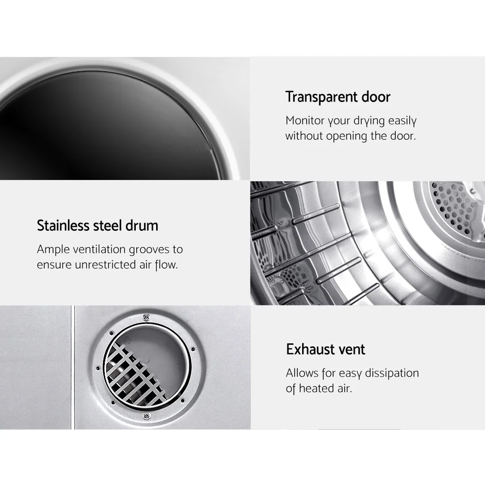 All-weather drying comes easy with our Devanti Tumble Dryer. No more worries about damp and half-dried clothes, as the dryer does an ideal job of delivering perfectly dried and fresher laundry every time. It has a simple digital control panel that is easy and intuitive to use, with no customisations required. On top of the standard drying mode, there is an airing mode for airing dry cleaned clothes or clothes in long storage and a delicates mode for gently drying garments made from delicate fabrics. Best of all, the intelligent humidity sensor detects the dampness of garments to turn the dryer off automatically once drying is done. This not only makes the dryer convenient and easy to use, but also saves energy as the running time is automatically adjusted depending on the state of the laundry. Additional useful features include a child-lock function and dual filters. Not least, a wall mounting kit is included should you choose to install the dryer that way. So do not be hung out and left to dry with your wet laundry. Do it with the Devanti Tumble Dryer.