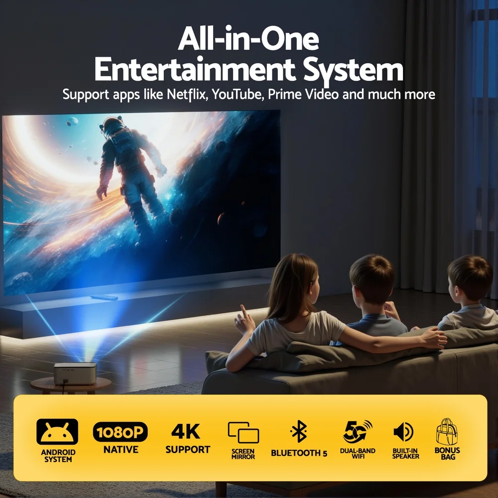 From the small screen to the big screen, now you can enjoy epic entertainment with our Devanti Video Projector. With its ultra-expansive colour gamut, the projector delivers crisp clear images with more brilliant colours to give you the best projection experience. The projector is fully 1080p compatible, so you won't have to compromise on quality. Using Wi-Fi connectivity, our video projector supports screencasting from your Phone, Pad, smartphone, tablet or laptop, so you can stream your favourite content effortlessly. It also features a built-in heavy bass speaker and a high-lumens lamp. For even more entertainment value, the projector includes HDMI, USB, AV and audio ports for fast connection to multiple devices such as external speakers, game consoles and hard disks. Comes with a remote control so you can power your entertainment straight from the couch. Get the home cinema experience and order yours today!
