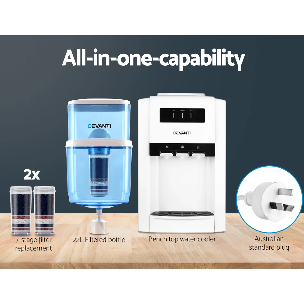 Filtered, clean and pure water on demand. With the Devanti Countertop Water Cooler, it could not be any easier. The large 22-litre water purifier container ensures that ample drinking water is always on call without hassle. Better still, the food-grade plastic container is refillable to ensure you can always have water anytime without having to wait for delivery of bottled water. Thanks to its 6-stage filtration system with two replacement filters that ensures your water tastes great and free of harmful chemicals and impurities. The cooler comes with three taps to deliver water at hot, cold or room temperature options. Plus, the cooler also comes with a smart detachable water guide plate that allows you to use bottled water if needed. The cooler is designed for safe use with protection against overheating, over-current, drying out and electric shocks. Not least, the cooler can be placed on any counter top for convenient use and the anti-slip feet ensure that the ensemble stays firmly in place.