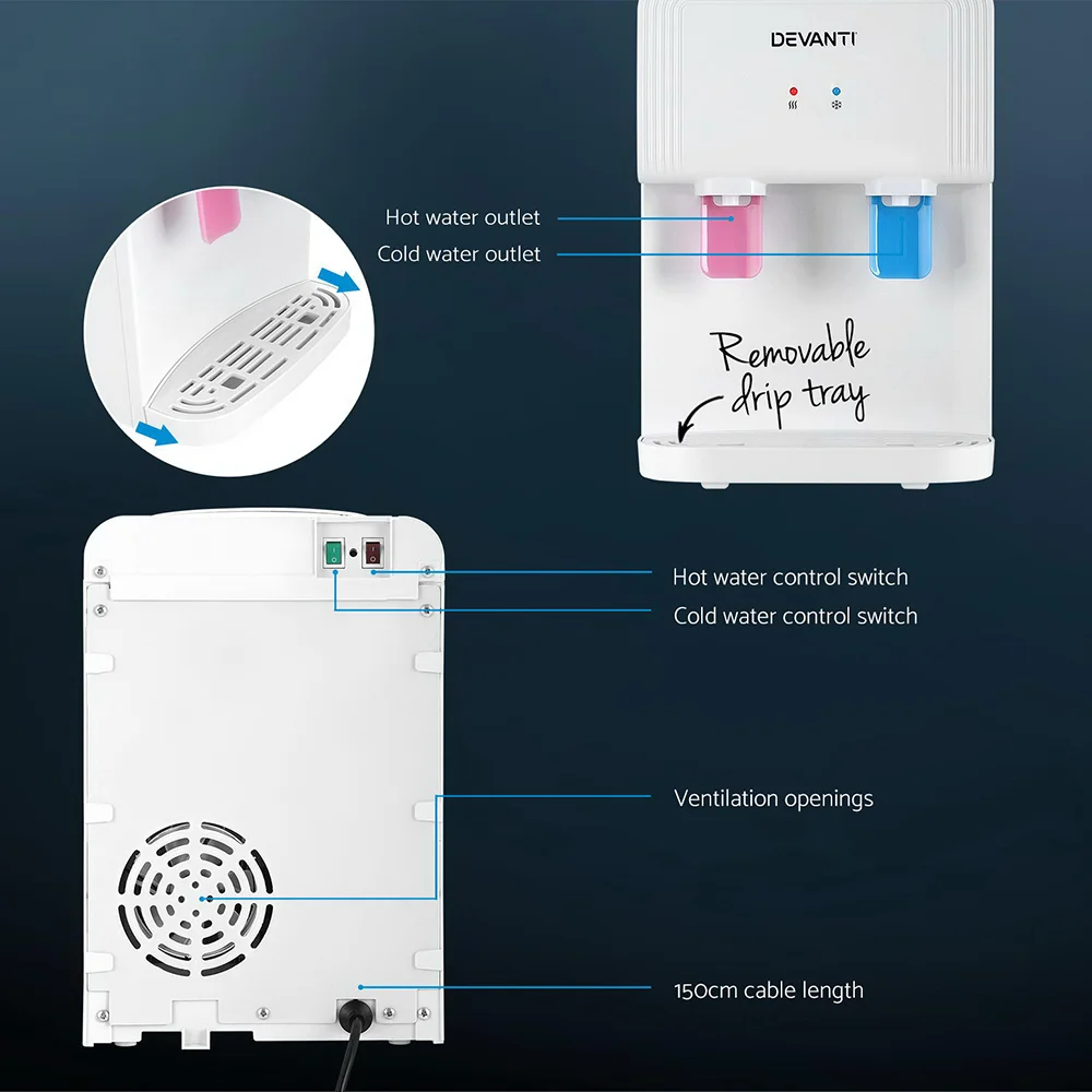 Introducing the Devanti Water Cooler, a top-loading unit featuring a 15-liter refillable purifier container. Equipped with electronic cooling technology, it offers both hot and cold waterspouts, tap water filtering, and robust safety measures including over-current, electric shock, dry-run, and overheat protection.