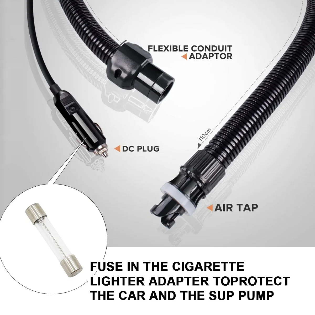 Easy to Use: This high pressure SUPs air pump features a portable design that is convenient and practical. You can easily carry it with you and use it anywhere with the 1m flexible air hose and the 3 meter DC car power cord.