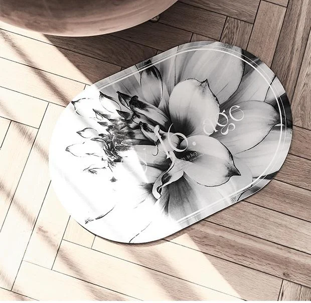 Enhance your home with this Elegant Floral Print Absorbent Floor Mat, perfect for bathrooms, entryways, or any area prone to moisture. This beautifully designed oval mat features intricate floral patterns and a sophisticated border with text. Crafted with a textured, leather-like surface, it offers a comfortable foot feel that isn't cold even in winter and is easy to clean. The mat boasts excellent water absorption capabilities, quickly wicking away moisture to keep your floors dry and safe. Its non-slip backing ensures it stays securely in place, providing added safety. Add a touch of elegance and practicality to your living space with this stylish and functional floor mat.