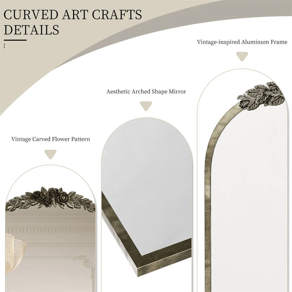 - Antique brass wall mirror with delicate rose molding, adds interest and artistry.