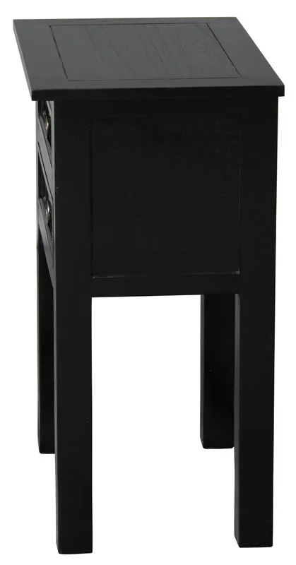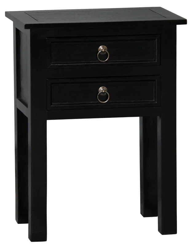 Nestled beside your favorite chair, the Elliot 2 Drawer Lamp Table doubles the delight. Crafted from Solid Mahogany Timber and detailed with elegant brass pulls, this table offers dual drawers to store and cherish your nightly reads and treasures. The serene black finish stands with a quiet dignity, promising to be the perfect companion to your evening repose.