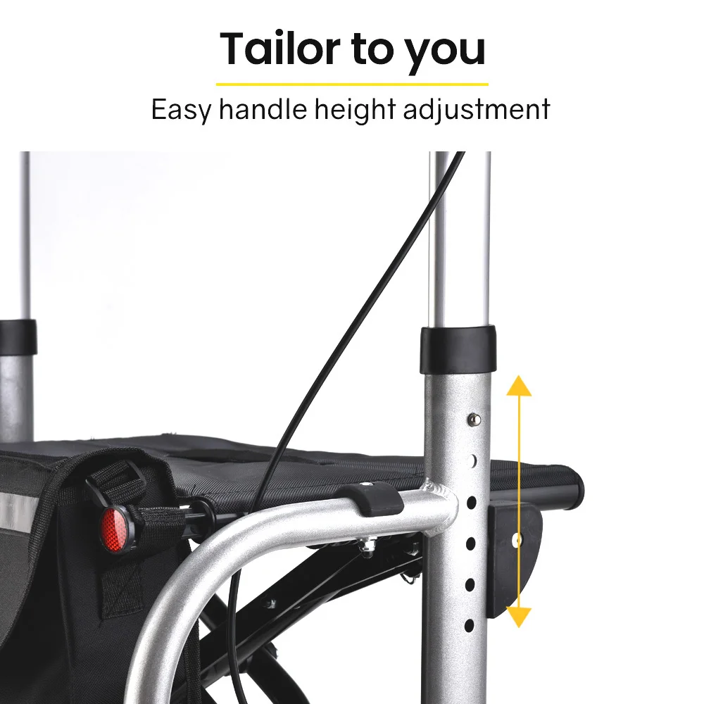 Large 8" PVC wheels allow the walking frame to roll smoothly over the bumps on a range of surfaces, and the soft rubber tread provides grip both inside and outside. The height adjustable handles offer a highly ergonomic design and feature easy-squeeze dual action brakes. Pushing down on the brake levers activates the park brakes, enabling you to take advantage of the stable seat to rest and watch the world go by.