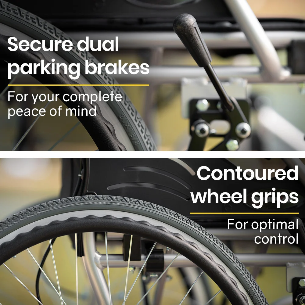 The large 20 rear tyres roll the wheelchair smoothly over the bumps on a range of surfaces. Not only that, they also offer the practicality of not requiring to be refilled with air and will never experience a puncture!