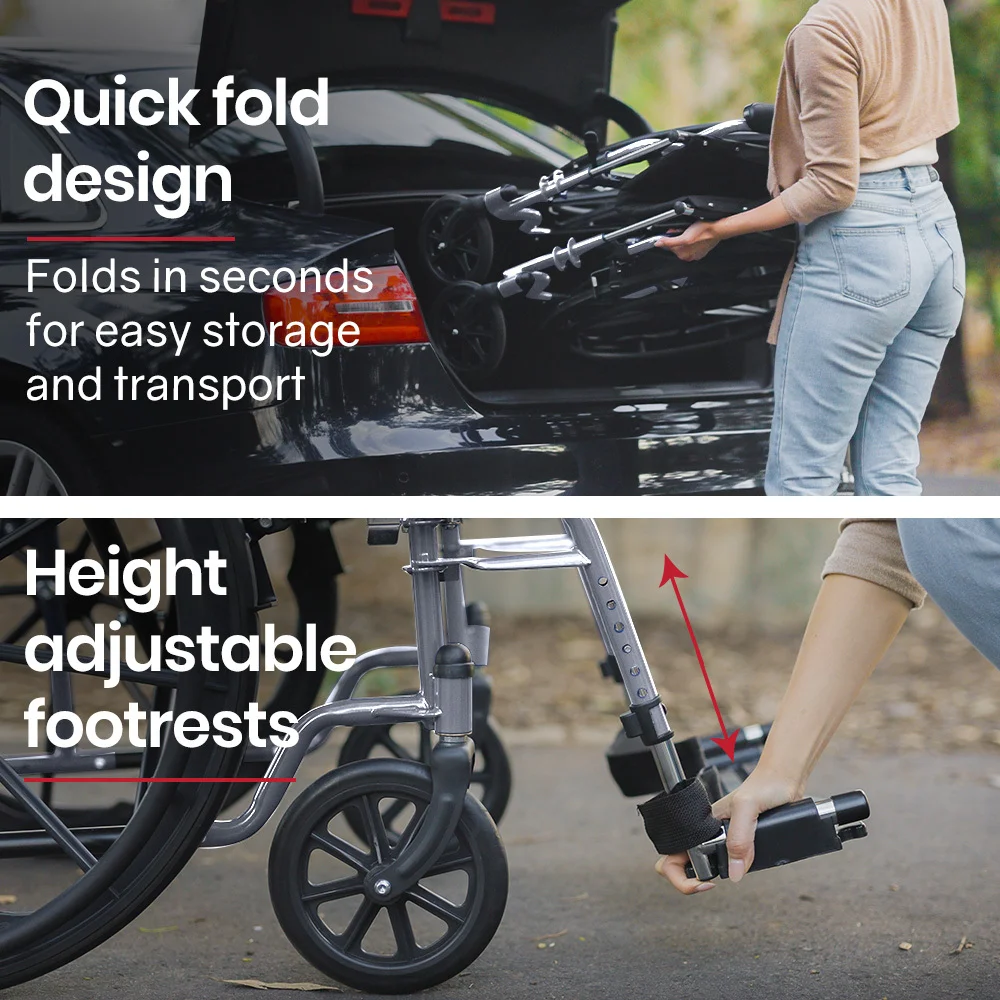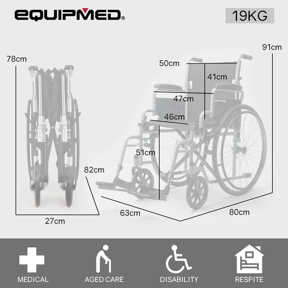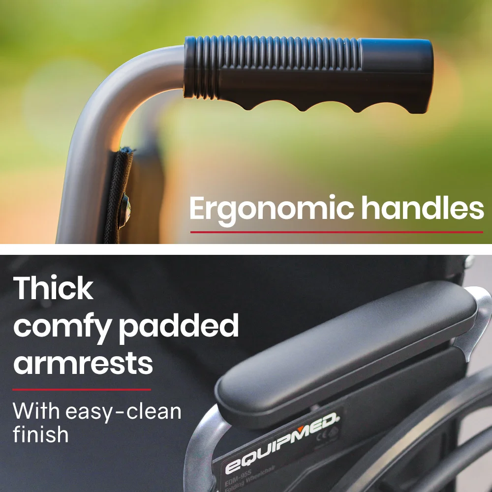 This Equimed wheel chair features height adjustable footrests that also swing out for easy access onto the wheel chair. Comfy padded armrests and a padded seat with generously proportioned backrest ensure a comfortable ride. The armrests have quick release levers which allow them to swing back to allow for convenient access at tables when dining. And, thanks to the 2 second folding action and ergonomic handles, it makes for a relaxing day out for any helpers, too!