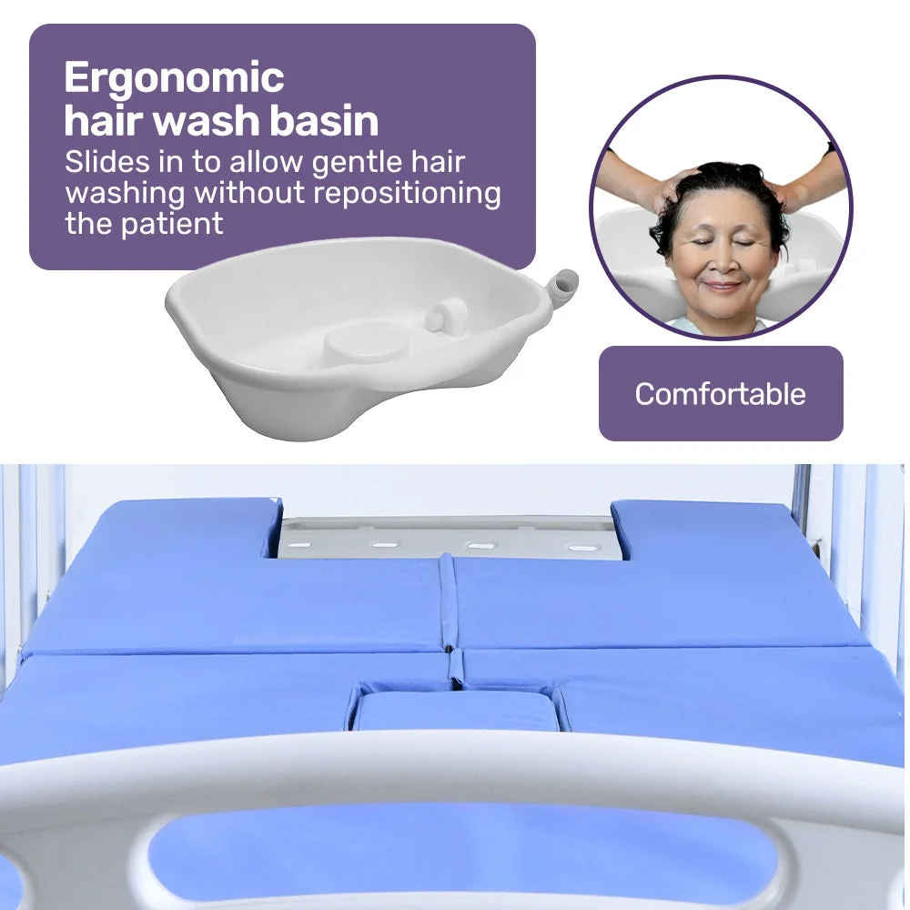 Thoughtful features include a built-in commode, hair wash basin, integrated I.V. pole and over-bed table to enhance usability. A high density, pressure equalising mattress prevents skin injury. A 200kg-rated steel and aluminium frame offers support and hygiene, while lockable, rubber castors ensure quiet safety.
