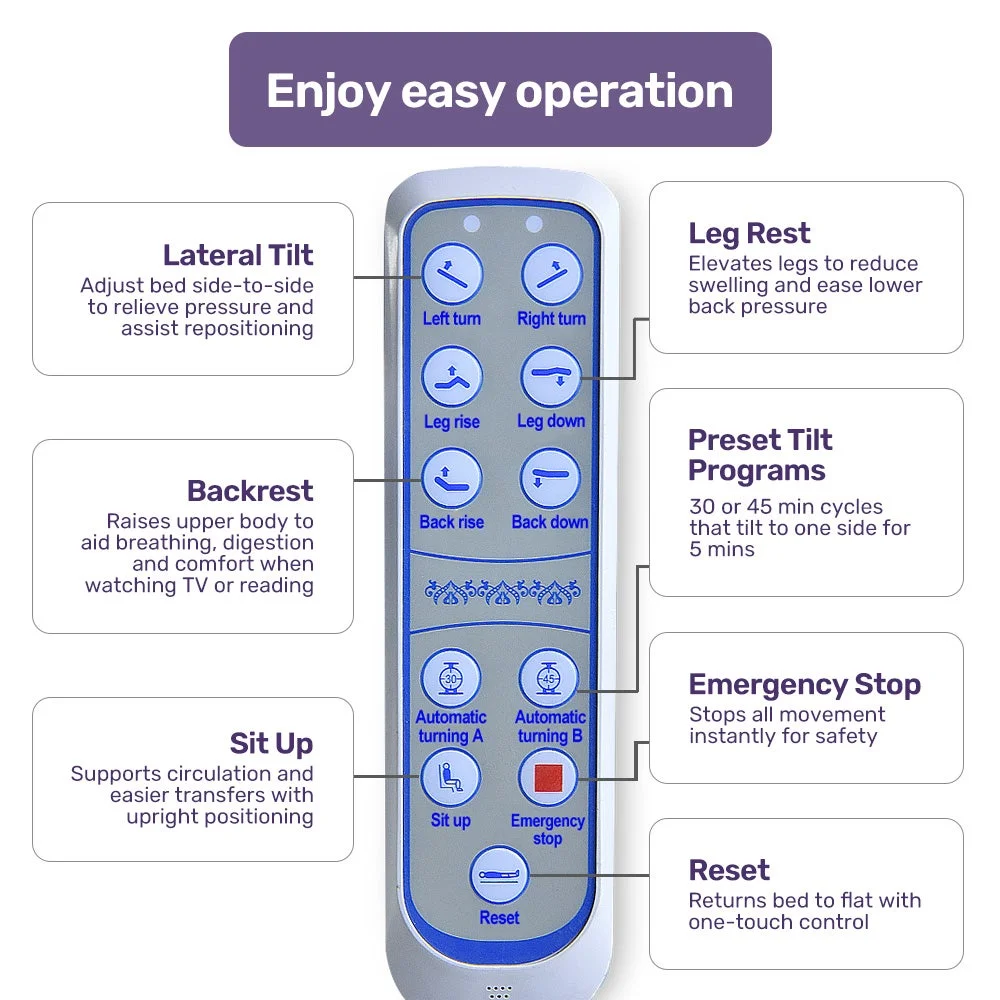 A key feature is its automatic turning assist function, which gently turns the user from their back to either side and back. This can be done at preset intervals. This supports circulation, reduces the risk of pressure injuries, and aids repositioning, minimising physical exertion and stress on the carer. Carers can rely on this feature to maintain user comfort through the night, significantly reducing fatigue and physical strain.