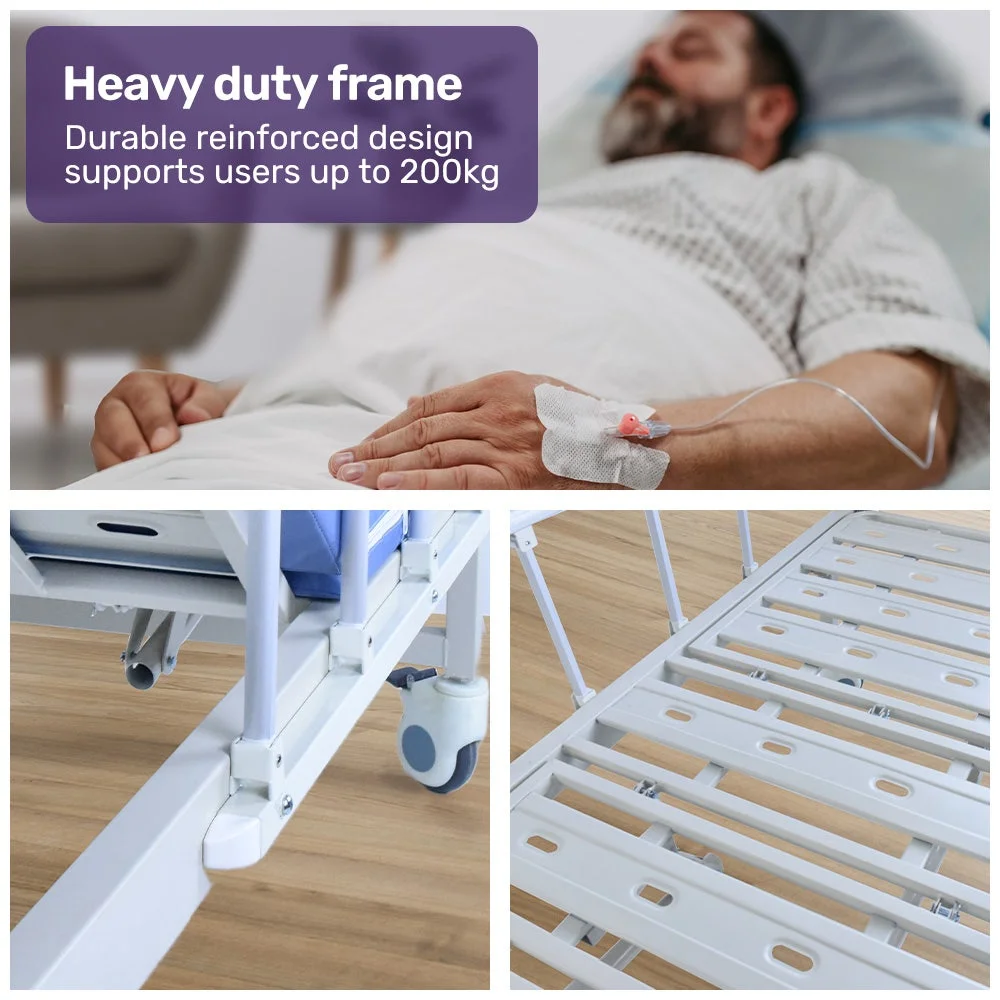 Thoughtful features include a built-in commode, hair wash basin, integrated I.V. pole and over-bed table to enhance usability. A high-density, pressure equalising mattress prevents skin injury. A 200kg-rated steel and aluminium frame offers support and hygiene, while lockable, rubber castors ensure quiet safety.